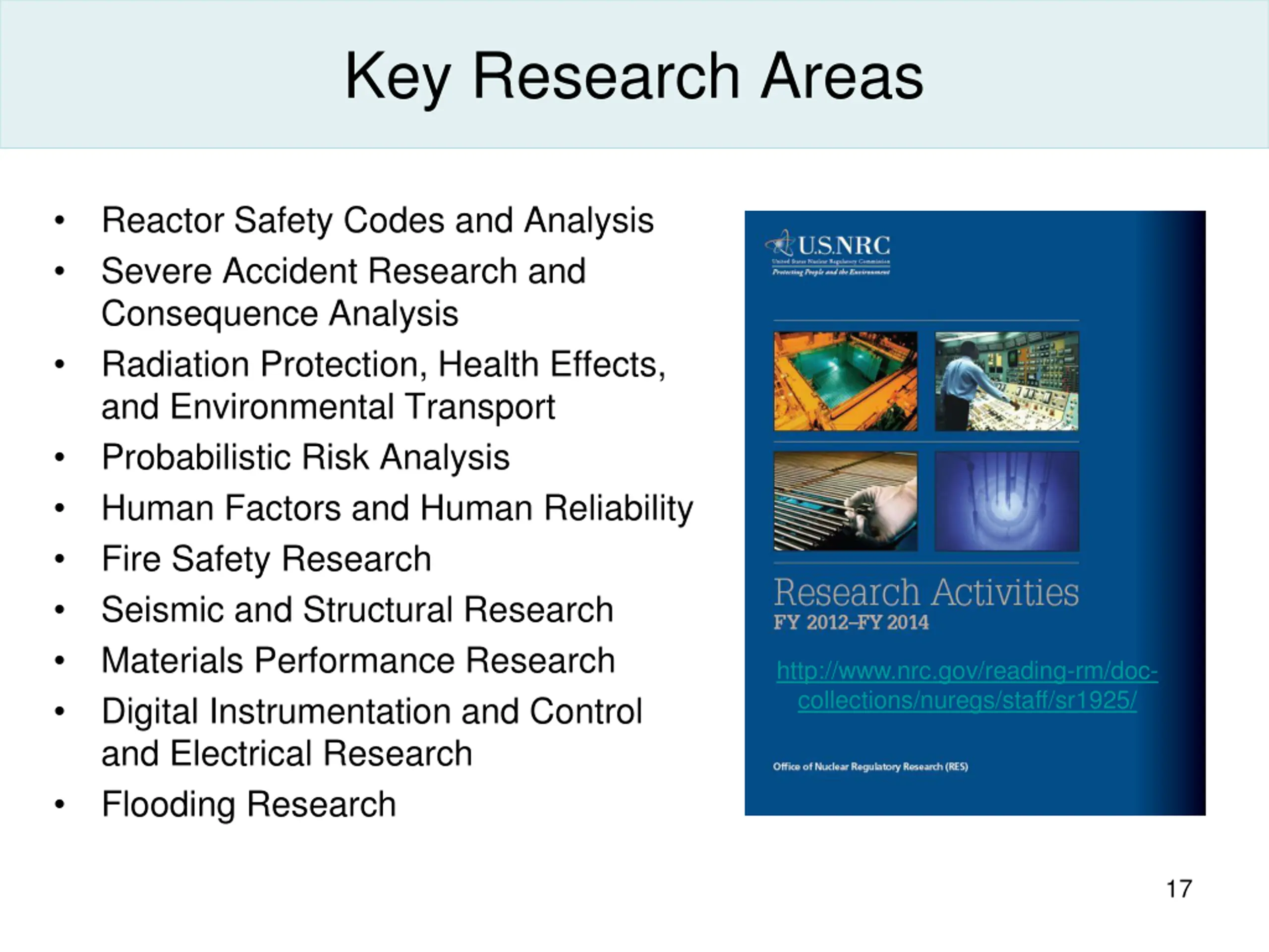 Key Research Areas Reactor Safety Codes and Analysis Severe Accident Research and Consequence Analysis Radiation Protection, Health Effects, and Environmental Transport Probabilistic Risk Analysis Human Factors and Human Reliability Fire Safety Research Seismic and Structural Research Materials Performance Research Digital Instrumentation and Control and Electrical Research Flooding Research http://www.nrc.gov/reading-rm/doc- collections/nuregs/staff/sr1925/ 17