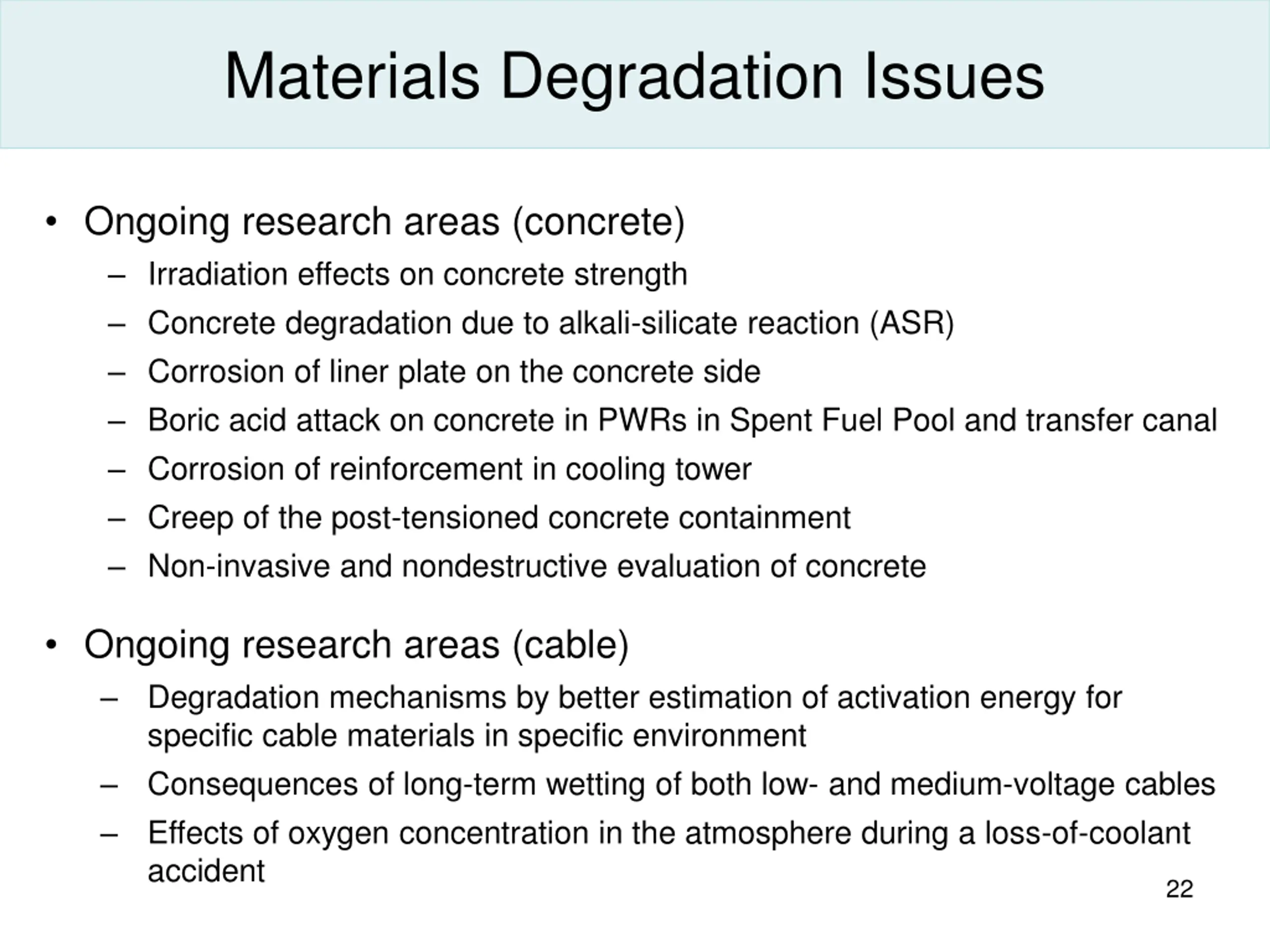 Materials Degradation Issues Ongoing research areas (concrete) Irradiation effects on concrete strength Concrete degradation due to alkali-silicate reaction (ASR) Corrosion of liner plate on the concrete side Boric acid attack on concrete in PWRs in Spent Fuel Pool and transfer canal Corrosion of reinforcement in cooling tower Creep of the post-tensioned concrete containment Non-invasive and nondestructive evaluation of concrete Ongoing research areas (cable) Degradation mechanisms by better estimation of activation energy for specific cable materials in specific environment Consequences of long-term wetting of both low- and medium-voltage cables Effects of oxygen concentration in the atmosphere during a loss-of-coolant accident 22