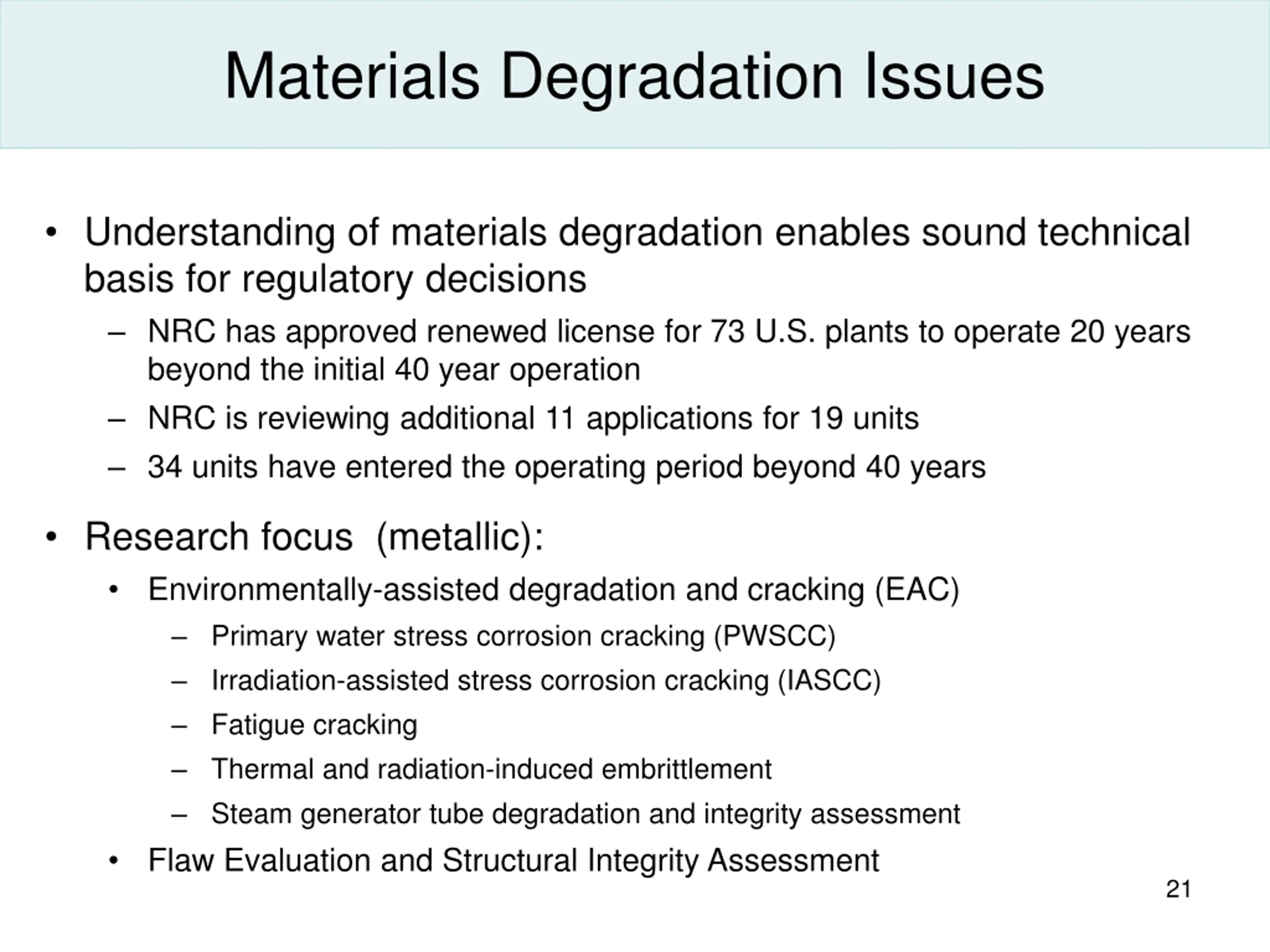 Materials Degradation Issues Understanding of materials degradation enables sound technical basis for regulatory decisions NRC has approved renewed license for 73 U.S. plants to operate 20 years beyond the initial 40 year operation NRC is reviewing additional 11 applications for 19 units 34 units have entered the operating period beyond 40 years Research focus (metallic): Environmentally-assisted degradation and cracking (EAC) Primary water stress corrosion cracking (PWSCC) Irradiation-assisted stress corrosion cracking (IASCC) Fatigue cracking Thermal and radiation-induced embrittlement Steam generator tube degradation and integrity assessment Flaw Evaluation and Structural Integrity Assessment 21