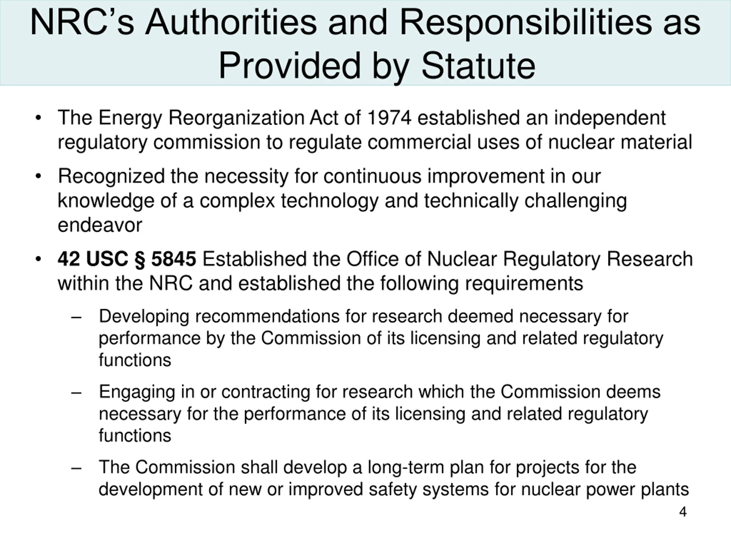 NRCs Authorities and Responsibilities as Provided by Statute The Energy Reorganization Act of 1974 established an independent regulatory commission to regulate commercial uses of nuclear material Recognized the necessity for continuous improvement in our knowledge of a complex technology and technically challenging endeavor 42 USC 5845 Established the Office of Nuclear Regulatory Research within the NRC and established the following requirements Developing recommendations for research deemed necessary for performance by the Commission of its licensing and related regulatory functions Engaging in or contracting for research which the Commission deems necessary for the performance of its licensing and related regulatory functions The Commission shall develop a long-term plan for projects for the development of new or improved safety systems for nuclear power plants 4
