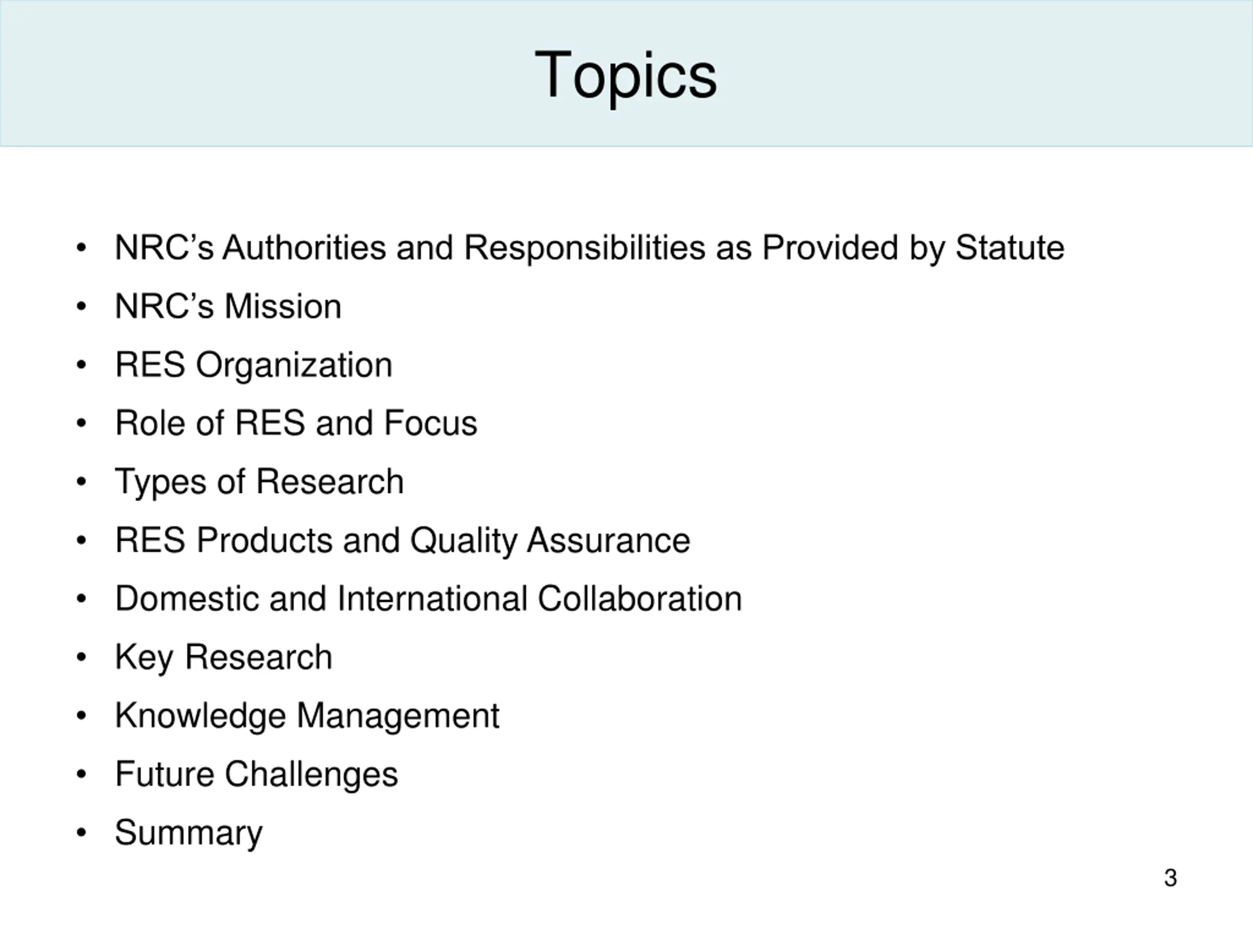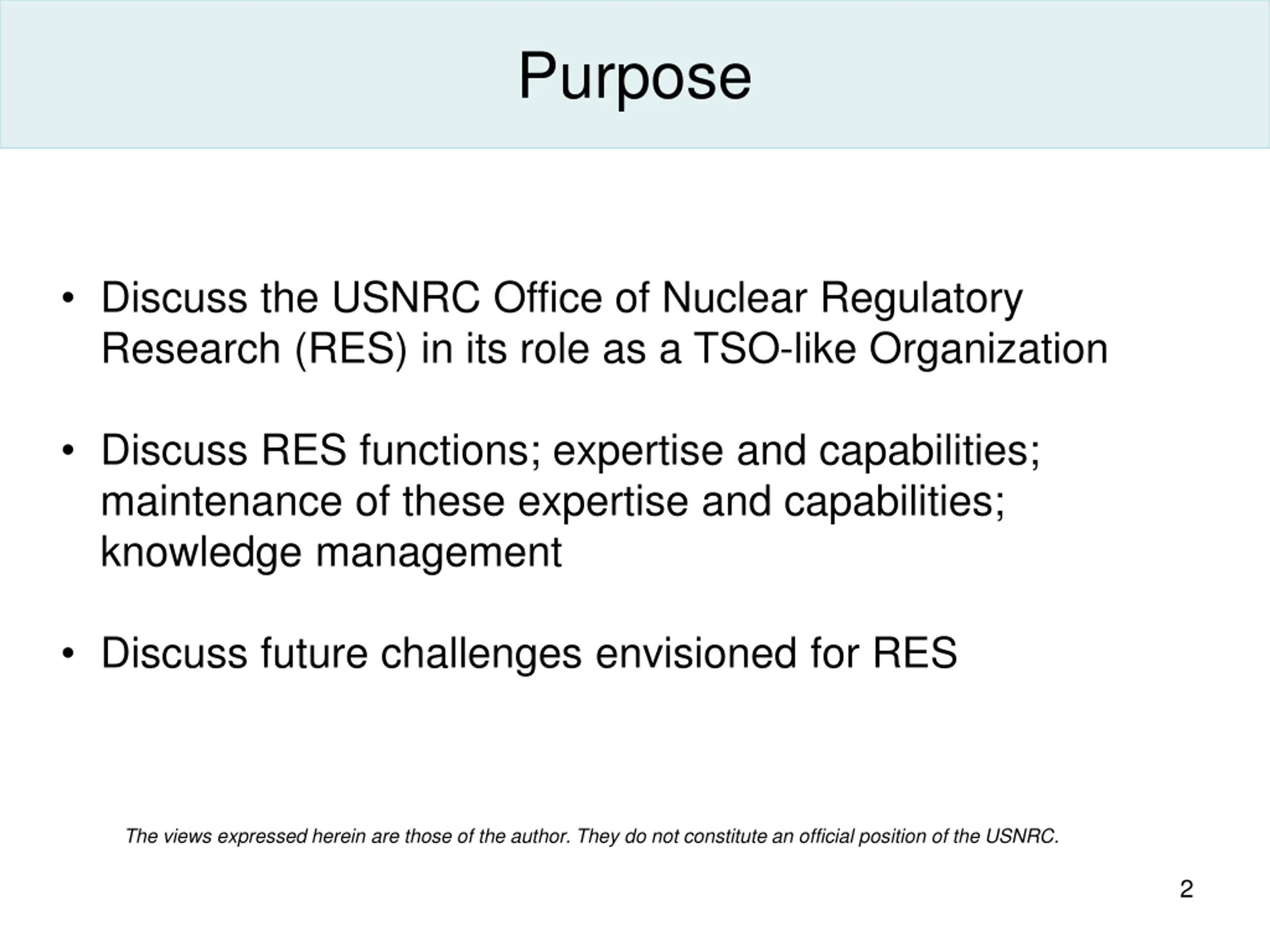 Purpose Discuss the USNRC Office of Nuclear Regulatory Research (RES) in its role as a TSO-like Organization Discuss RES functions; expertise and capabilities; maintenance of these expertise and capabilities; knowledge management Discuss future challenges envisioned for RES The views expressed herein are those of the author. They do not constitute an official position of the USNRC. 2