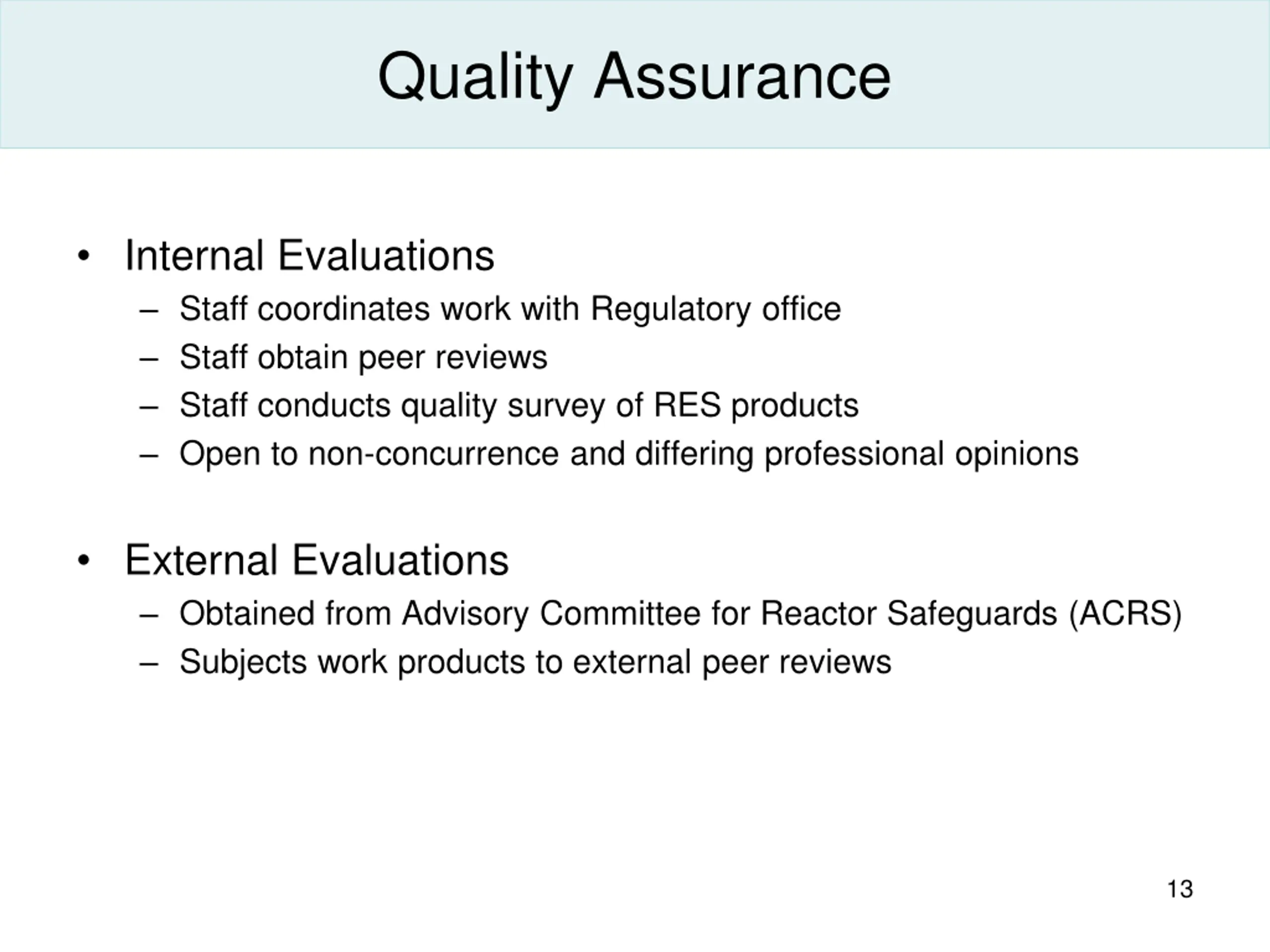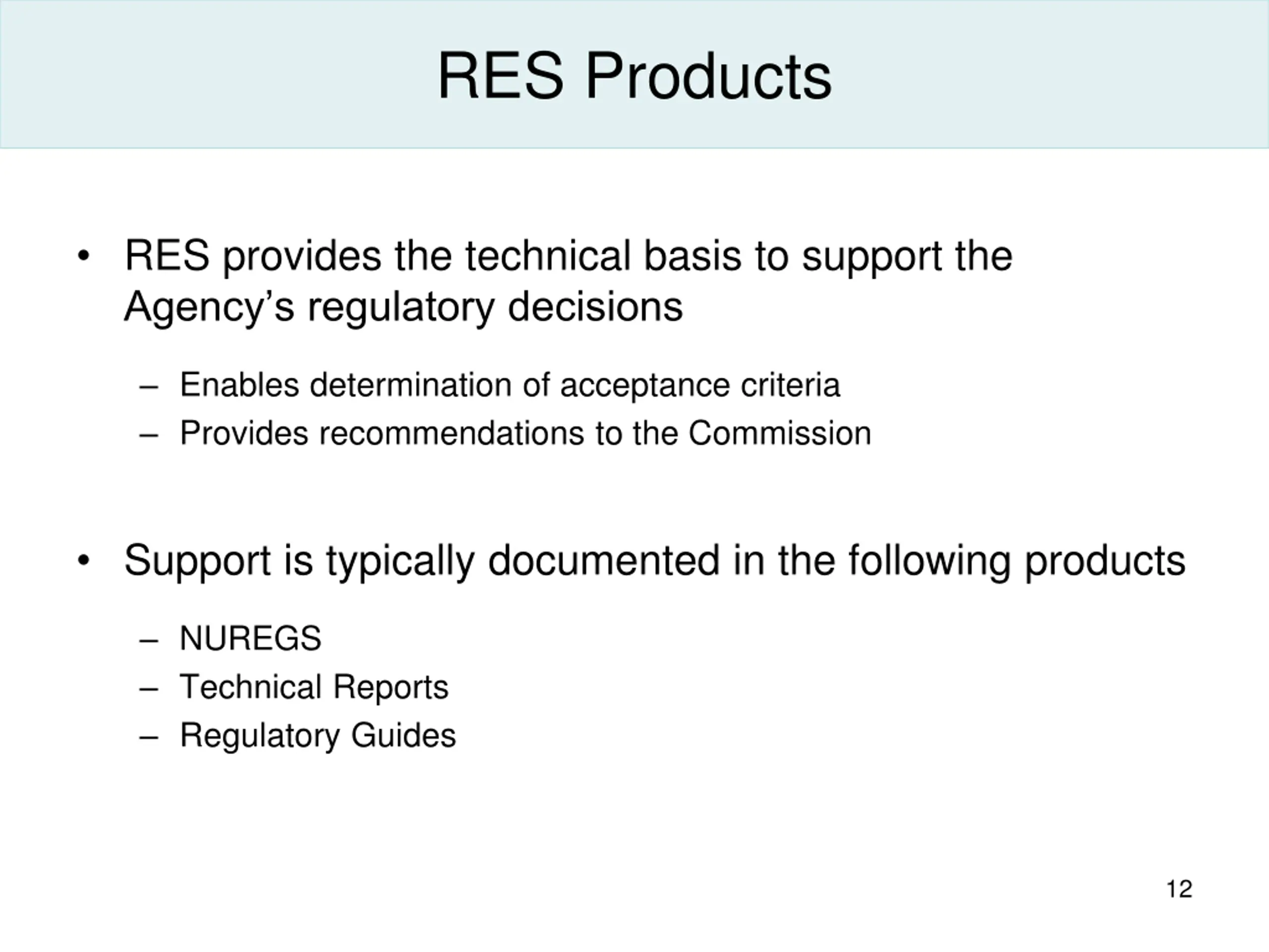 RES Products RES provides the technical basis to support the Agency s regulatory decisions Enables determination of acceptance criteria Provides recommendations to the Commission Support is typically documented in the following products NUREGS Technical Reports Regulatory Guides 12 12