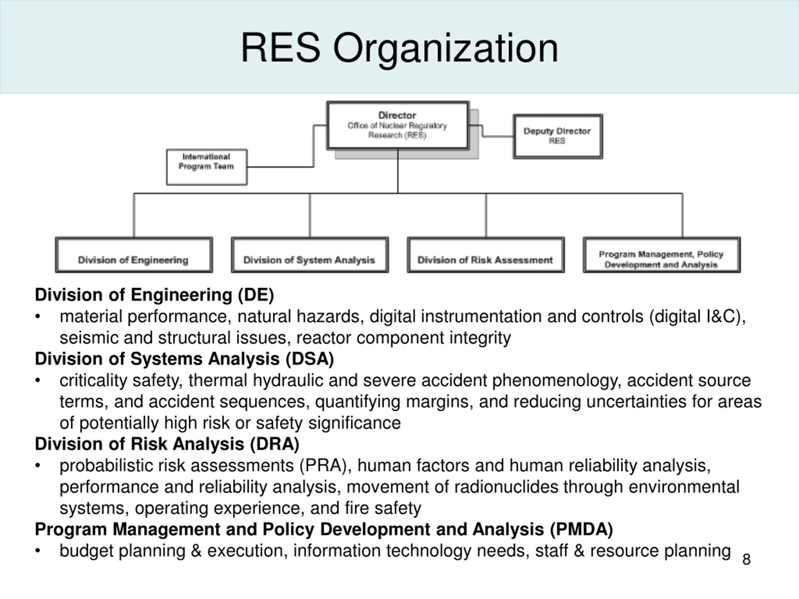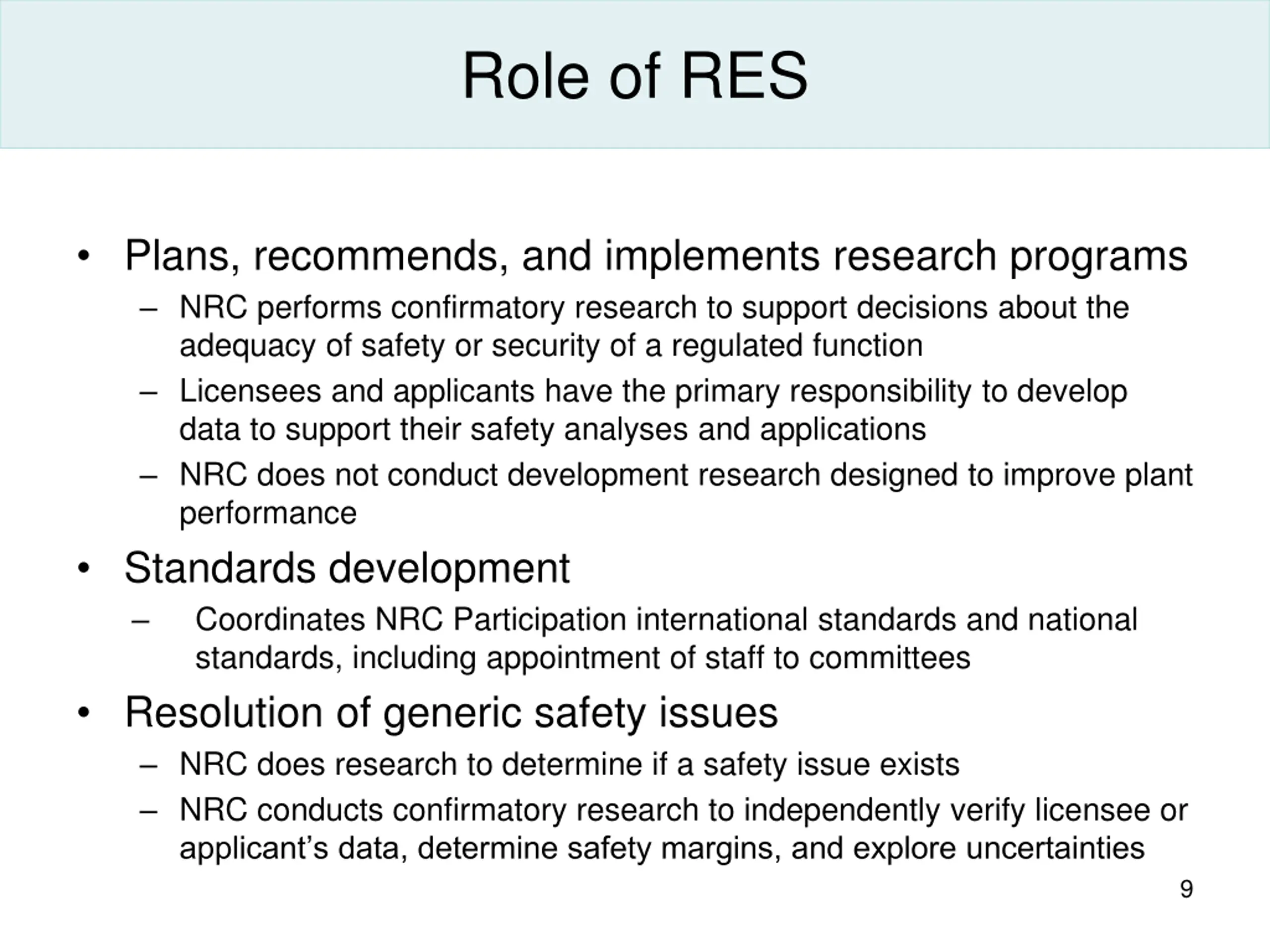 RES Organization Division of Engineering (DE) material performance, natural hazards, digital instrumentation and controls (digital I&C), seismic and structural issues, reactor component integrity Division of Systems Analysis (DSA) criticality safety, thermal hydraulic and severe accident phenomenology, accident source terms, and accident sequences, quantifying margins, and reducing uncertainties for areas of potentially high risk or safety significance Division of Risk Analysis (DRA) probabilistic risk assessments (PRA), human factors and human reliability analysis, performance and reliability analysis, movement of radionuclides through environmental systems, operating experience, and fire safety Program Management and Policy Development and Analysis (PMDA) budget planning & execution, information technology needs, staff & resource planning8