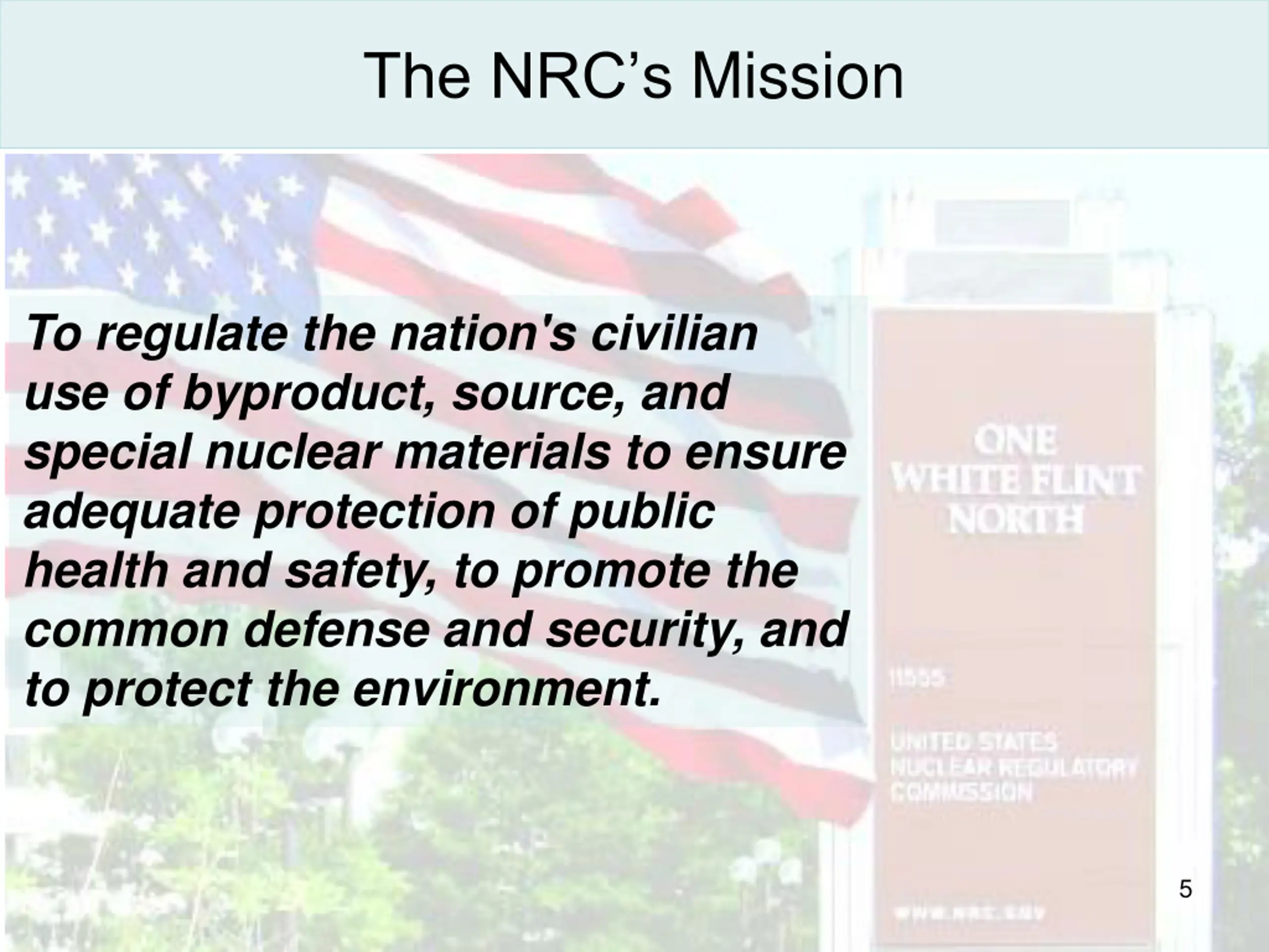 The NRCs Mission To regulate the nation's civilian use of byproduct, source, and special nuclear materials to ensure adequate protection of public health and safety, to promote the common defense and security, and to protect the environment. 5