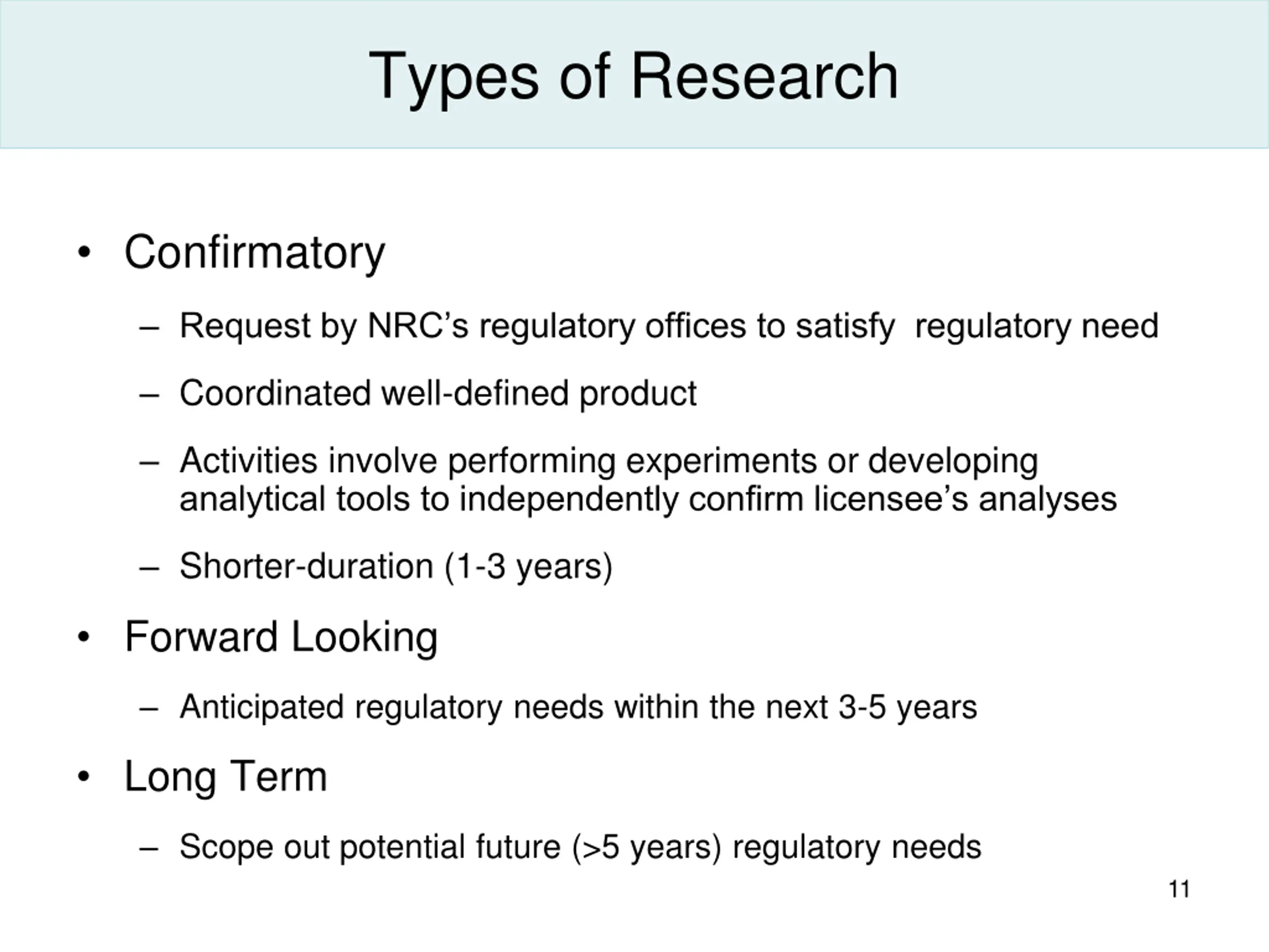 Focus of RES Unlike technical programs in some TSOs, the NRC research program aims to improve the knowledge where uncertainties exist safety margins not well characterized resolution of technical issues needed to support regulatory decisions Confirming the technical basis for regulatory decisions Assessing technical issues Developing methods and tools Looking for emerging technologies and issues Translating technical information into regulatory guidance 10