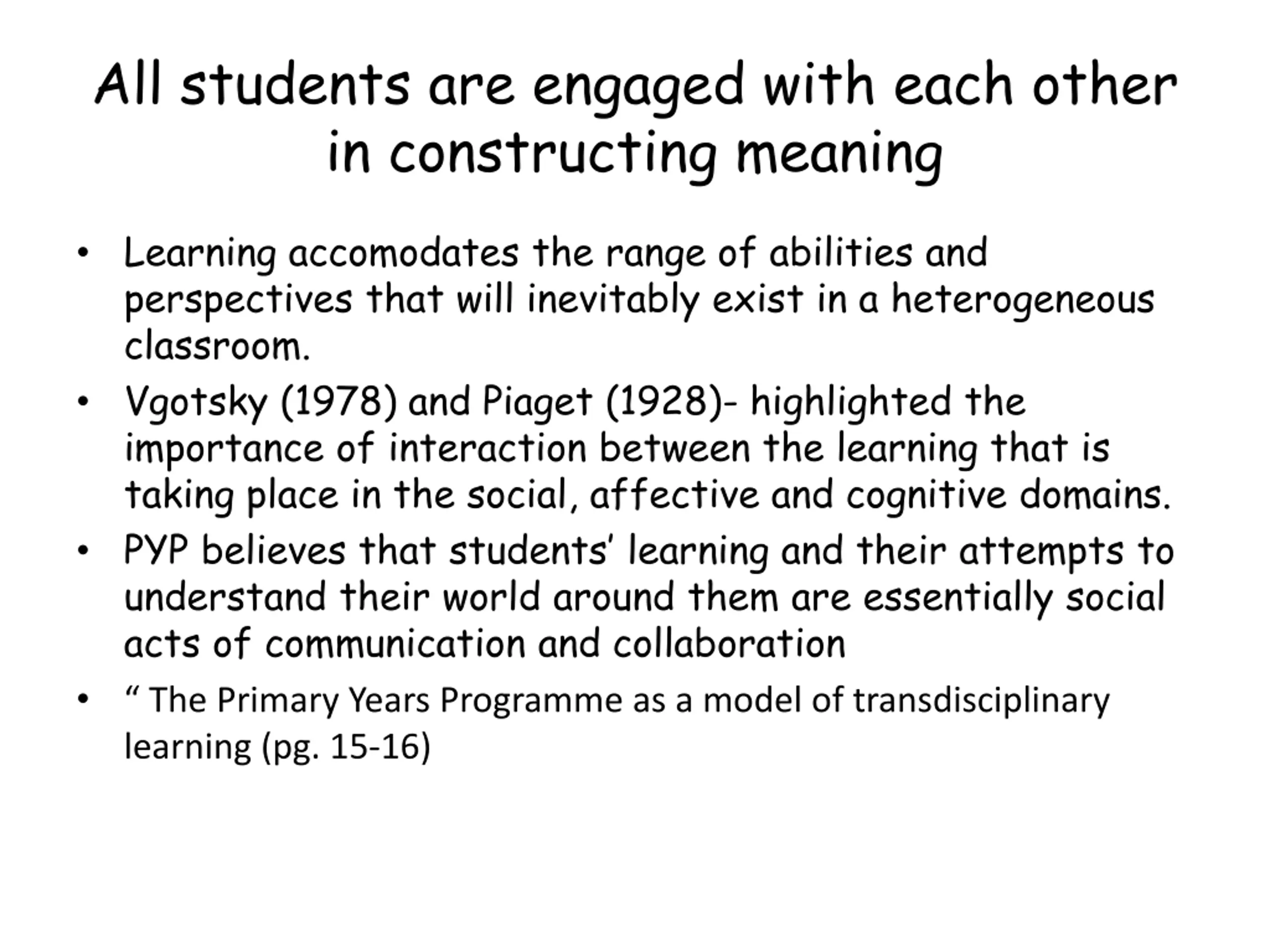 All students are engaged with each other in constructing meaning Learning accomodates the range of abilities and perspectives that will inevitably exist in a heterogeneous classroom. Vgotsky (1978) and Piaget (1928)- highlighted the importance of interaction between the learning that is taking place in the social, affective and cognitive domains. PYP believes that students learning and their attempts to understand their world around them are essentially social acts of communication and collaboration The Primary Years Programme as a model of transdisciplinary learning (pg. 15-16)
