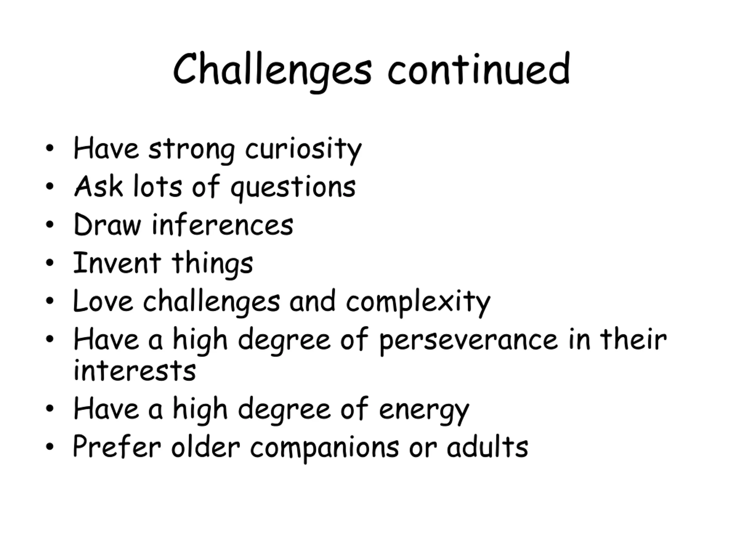 Challenges continued Have strong curiosity Ask lots of questions Draw inferences Invent things Love challenges and complexity Have a high degree of perseverance in their interests Have a high degree of energy Prefer older companions or adults