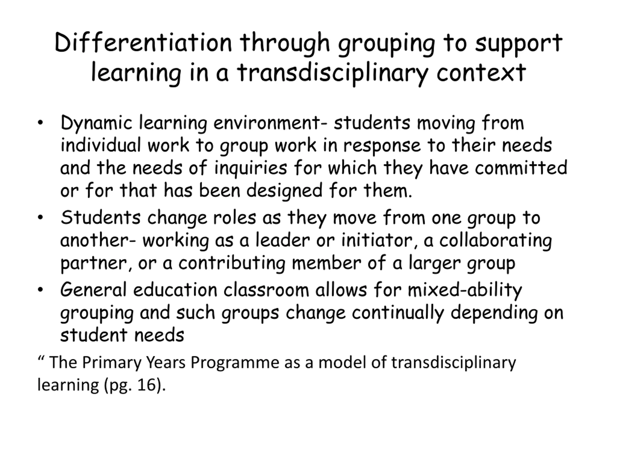 Differentiation through grouping to support learning in a transdisciplinary context Dynamic learning environment- students moving from individual work to group work in response to their needs and the needs of inquiries for which they have committed or for that has been designed for them. Students change roles as they move from one group to another- working as a leader or initiator, a collaborating partner, or a contributing member of a larger group General education classroom allows for mixed-ability grouping and such groups change continually depending on student needs The Primary Years Programme as a model of transdisciplinary learning (pg. 16).