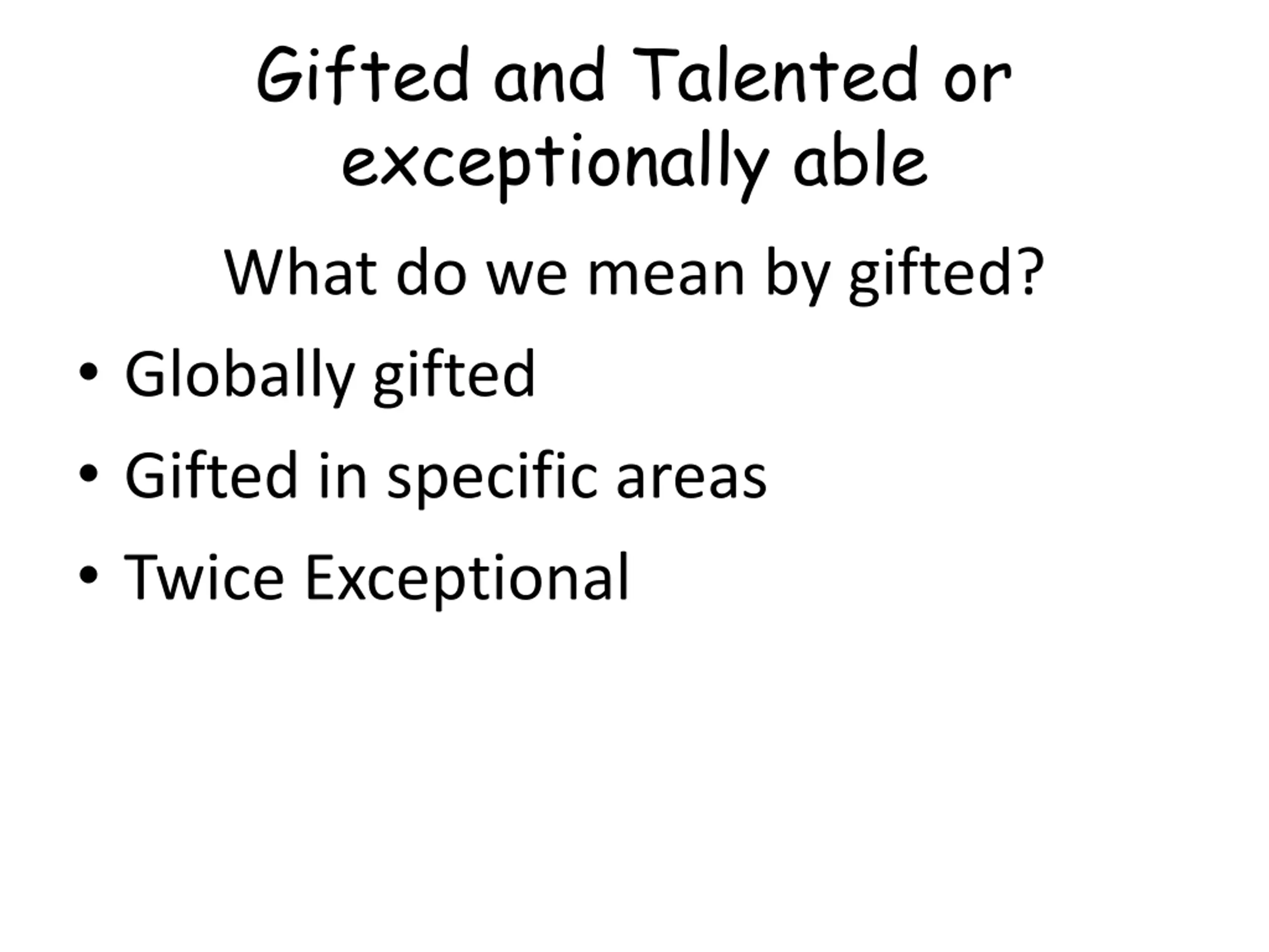 Gifted and Talented or exceptionally able What do we mean by gifted? Globally gifted Gifted in specific areas Twice Exceptional