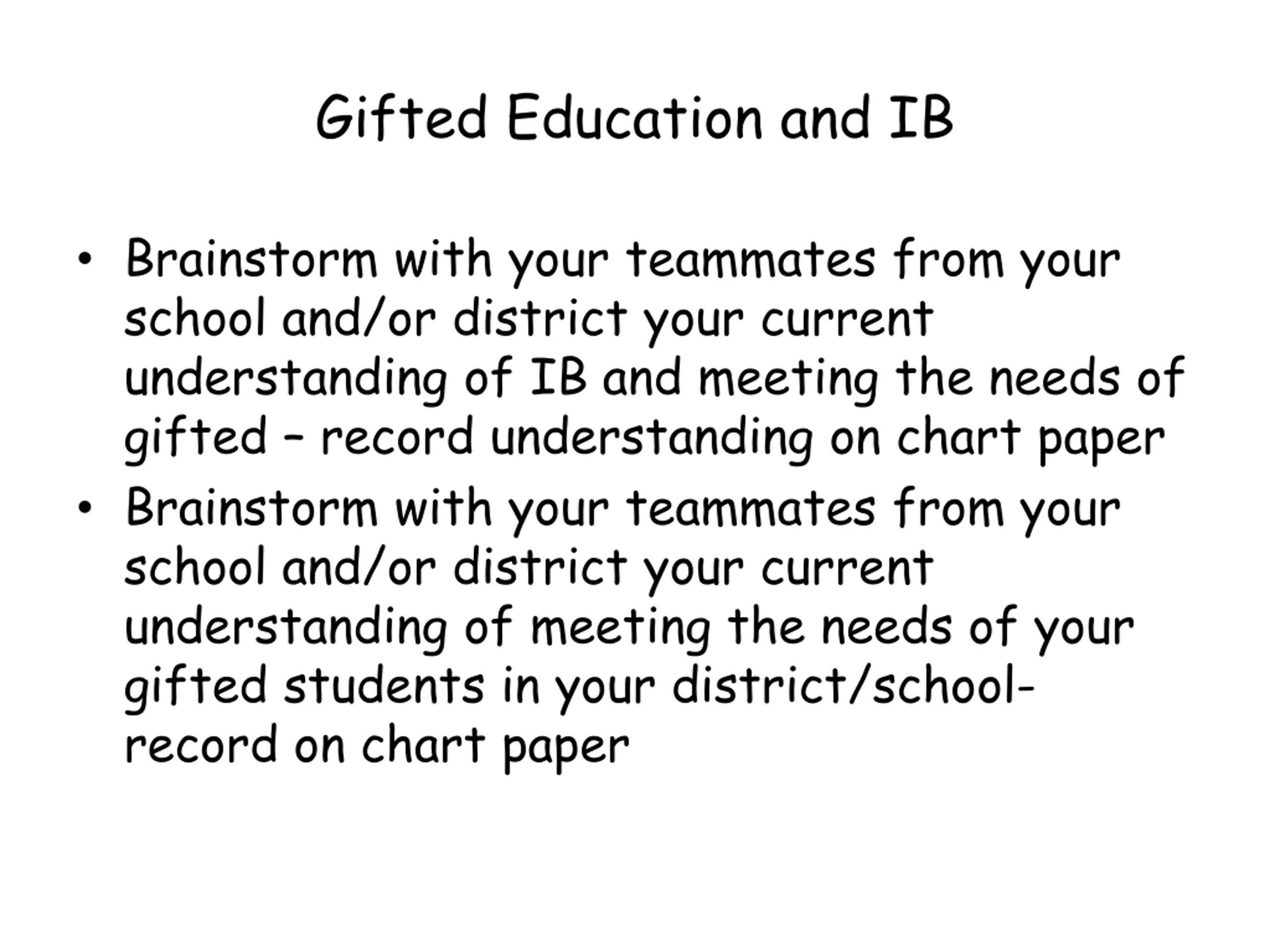 Gifted Education and IB Brainstorm with your teammates from your school and/or district your current understanding of IB and meeting the needs of gifted record understanding on chart paper Brainstorm with your teammates from your school and/or district your current understanding of meeting the needs of your gifted students in your district/school- record on chart paper