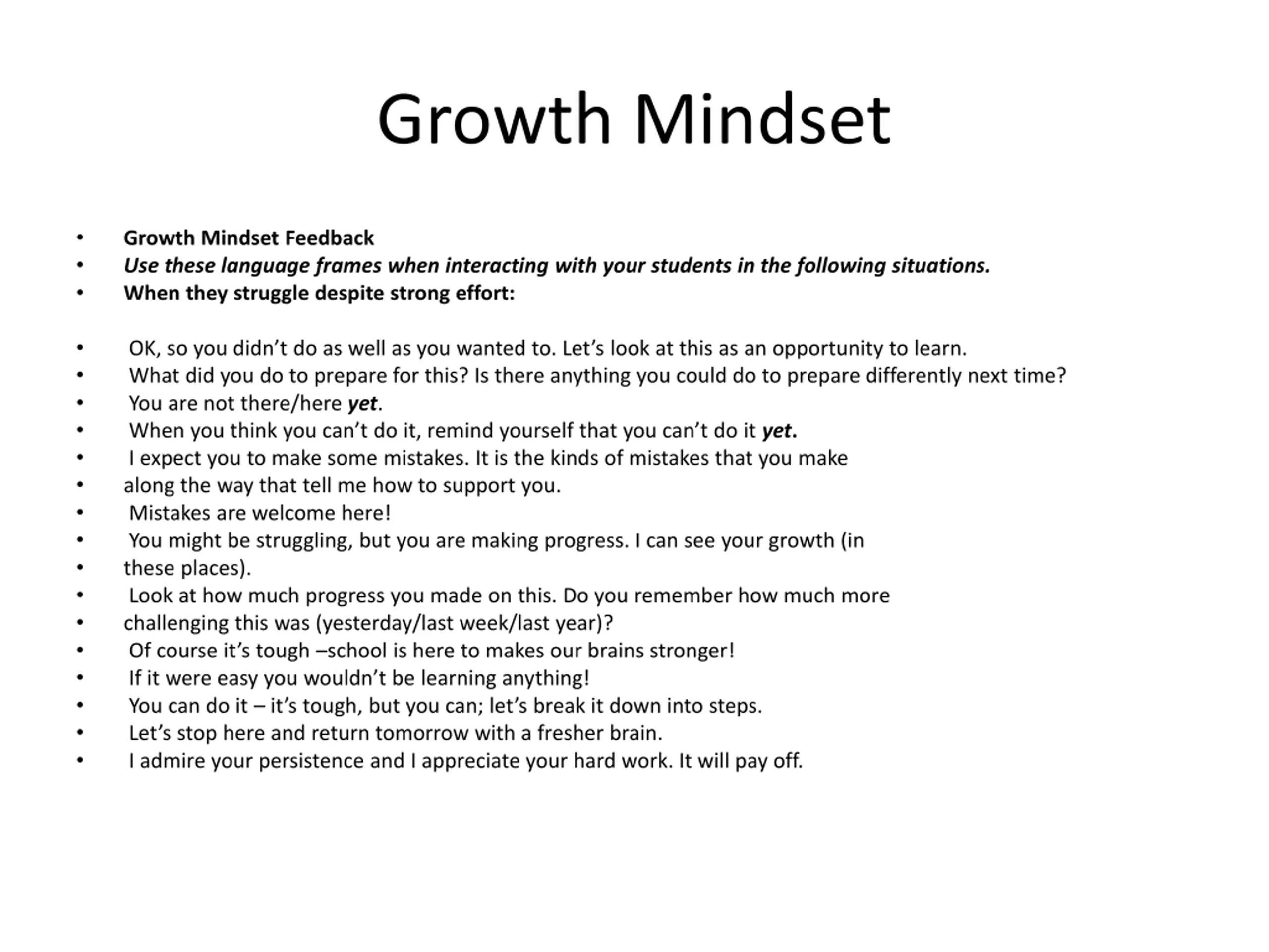 Growth Mindset Growth Mindset Feedback Use these language frames when interacting with your students in the following situations. When they struggle despite strong effort: OK, so you didn t do as well as you wanted to. Let s look at this as an opportunity to learn. What did you do to prepare for this? Is there anything you could do to prepare differently next time? You are not there/here yet. When you think you can t do it, remind yourself that you can t do it yet. I expect you to make some mistakes. It is the kinds of mistakes that you make along the way that tell me how to support you. Mistakes are welcome here! You might be struggling, but you are making progress. I can see your growth (in these places). Look at how much progress you made on this. Do you remember how much more challenging this was (yesterday/last week/last year)? Of course it s tough school is here to makes our brains stronger! If it were easy you wouldn t be learning anything! You can do it it s tough, but you can; let s break it down into steps. Let s stop here and return tomorrow with a fresher brain. I admire your persistence and I appreciate your hard work. It will pay off.