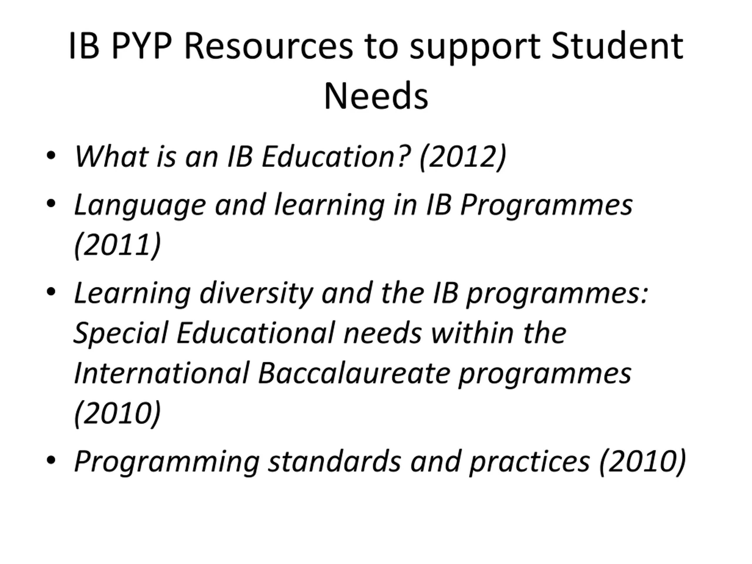 IB PYP Resources to support Student Needs What is an IB Education? (2012) Language and learning in IB Programmes (2011) Learning diversity and the IB programmes: Special Educational needs within the International Baccalaureate programmes (2010) Programming standards and practices (2010)