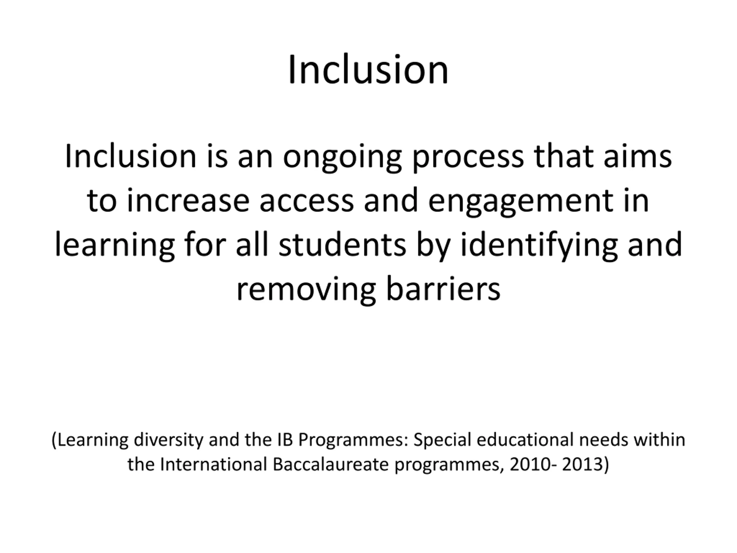 Inclusion Inclusion is an ongoing process that aims to increase access and engagement in learning for all students by identifying and removing barriers (Learning diversity and the IB Programmes: Special educational needs within the International Baccalaureate programmes, 2010- 2013)