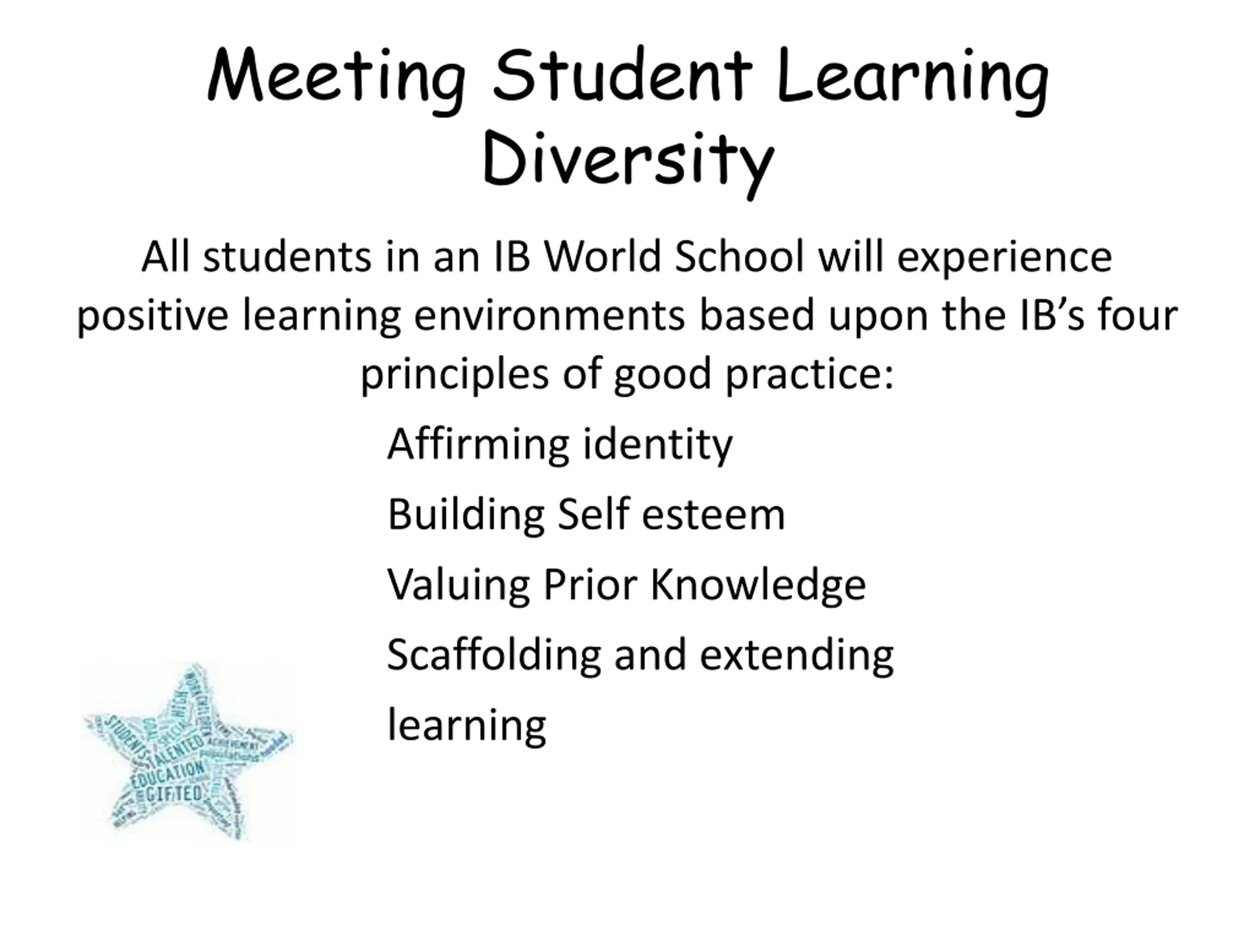 Meeting Student Learning Diversity All students in an IB World School will experience positive learning environments based upon the IB s four principles of good practice: Affirming identity Building Self esteem Valuing Prior Knowledge Scaffolding and extending learning