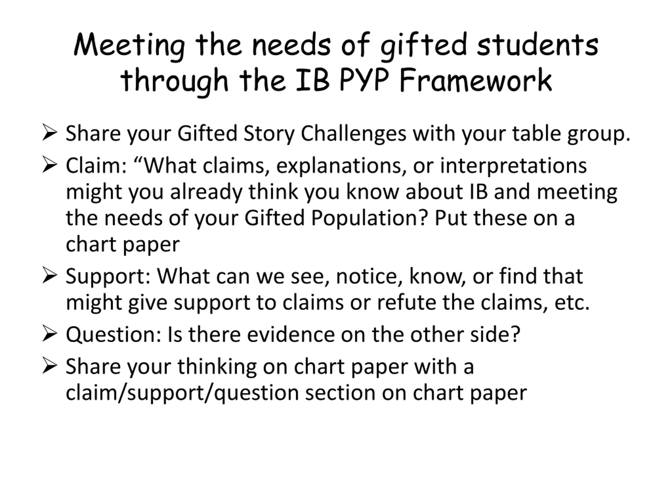 Meeting the needs of gifted students through the IB PYP Framework Share your Gifted Story Challenges with your table group. Claim: What claims, explanations, or interpretations might you already think you know about IB and meeting the needs of your Gifted Population? Put these on a chart paper Support: What can we see, notice, know, or find that might give support to claims or refute the claims, etc. Question: Is there evidence on the other side? Share your thinking on chart paper with a claim/support/question section on chart paper