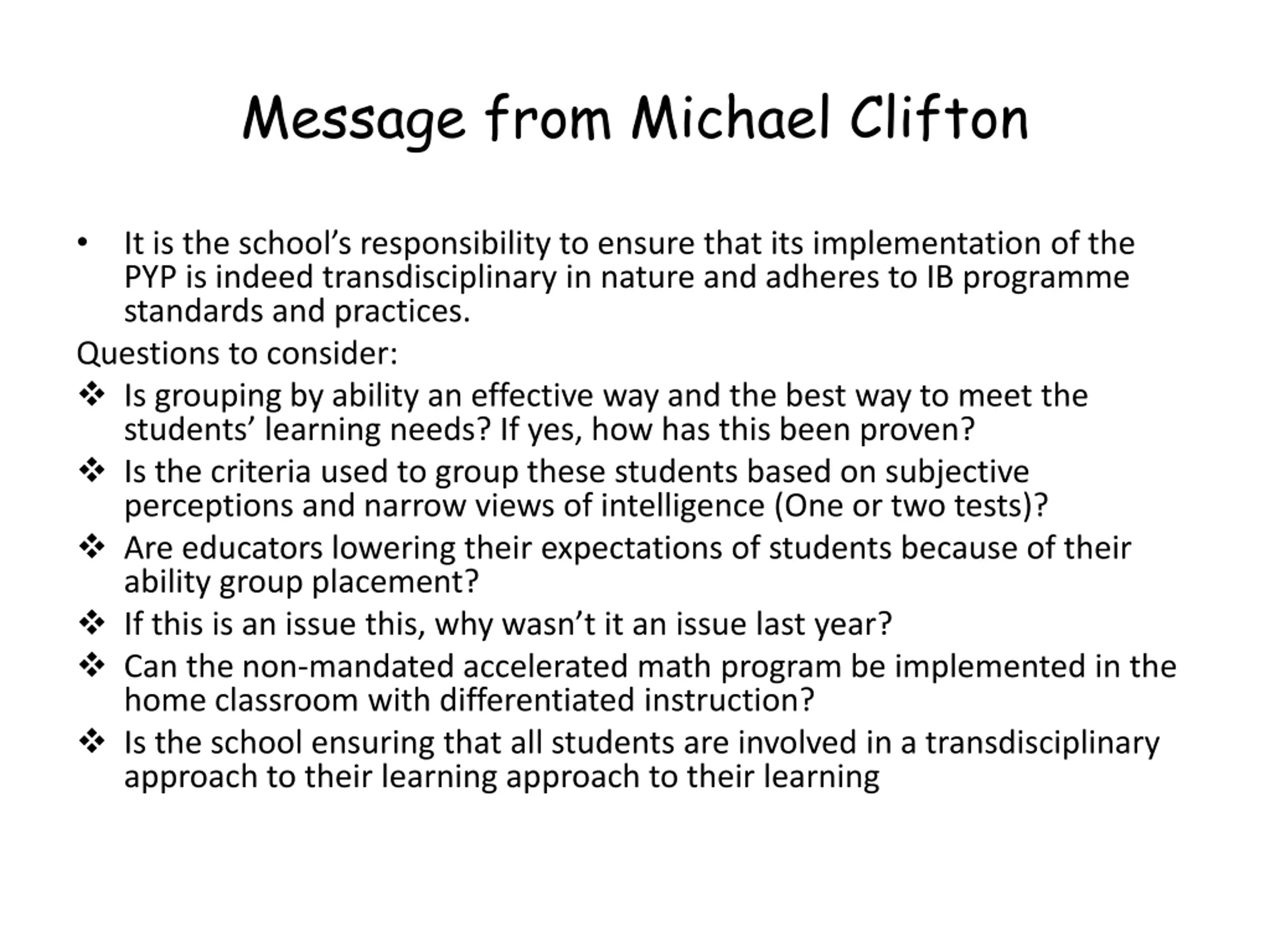 Message from Michael Clifton It is the school s responsibility to ensure that its implementation of the PYP is indeed transdisciplinary in nature and adheres to IB programme standards and practices. Questions to consider: Is grouping by ability an effective way and the best way to meet the students learning needs? If yes, how has this been proven? Is the criteria used to group these students based on subjective perceptions and narrow views of intelligence (One or two tests)? Are educators lowering their expectations of students because of their ability group placement? If this is an issue this, why wasn t it an issue last year? Can the non-mandated accelerated math program be implemented in the home classroom with differentiated instruction? Is the school ensuring that all students are involved in a transdisciplinary approach to their learning approach to their learning