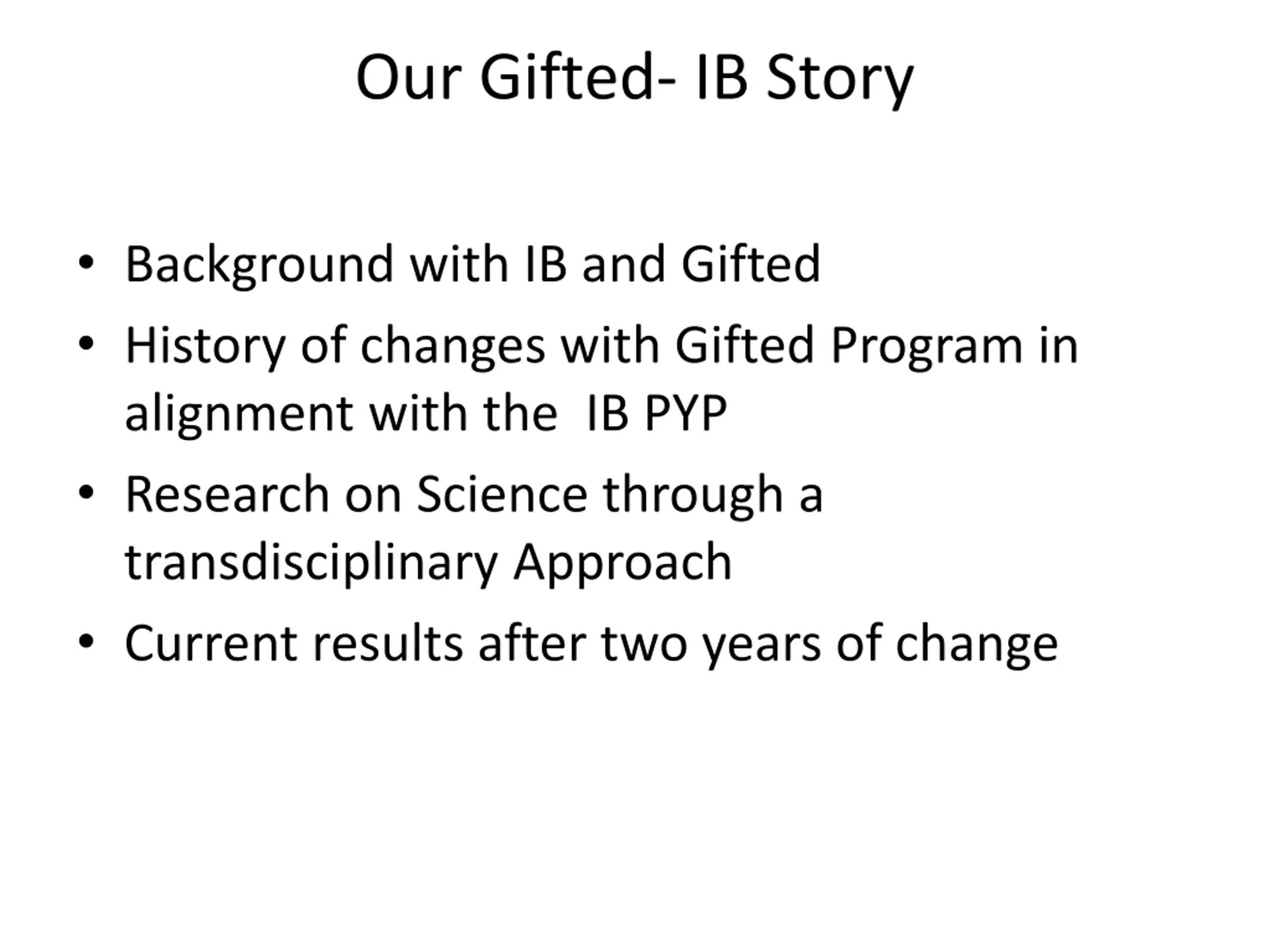 Our Gifted- IB Story Background with IB and Gifted History of changes with Gifted Program in alignment with the IB PYP Research on Science through a transdisciplinary Approach Current results after two years of change