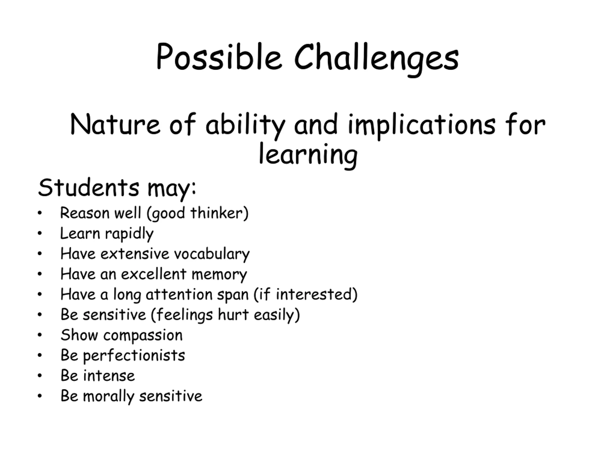 Possible Challenges Nature of ability and implications for learning Students may: Reason well (good thinker) Learn rapidly Have extensive vocabulary Have an excellent memory Have a long attention span (if interested) Be sensitive (feelings hurt easily) Show compassion Be perfectionists Be intense Be morally sensitive