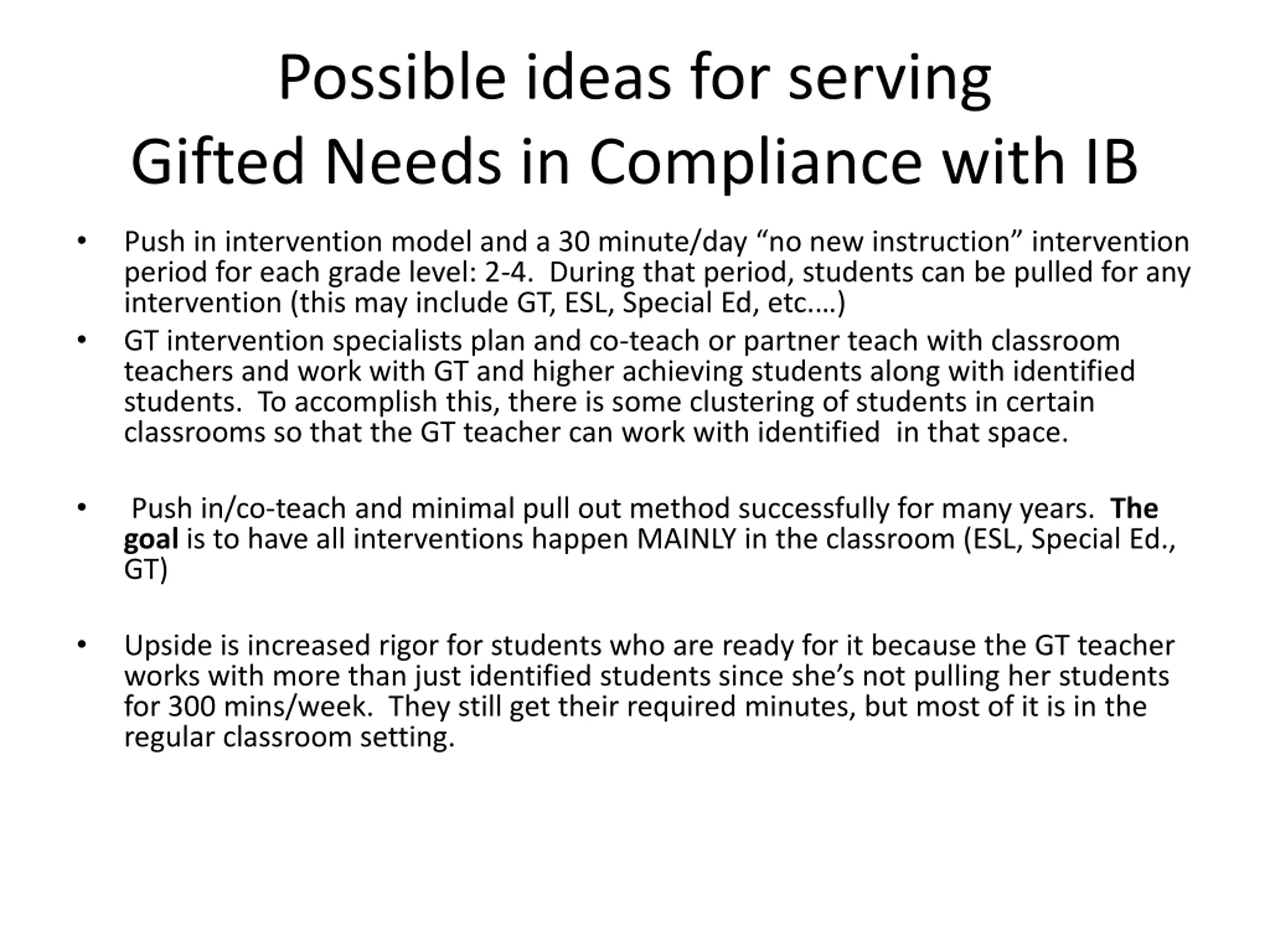 Possible ideas for serving Gifted Needs in Compliance with IB Push in intervention model and a 30 minute/day no new instruction intervention period for each grade level: 2-4. During that period, students can be pulled for any intervention (this may include GT, ESL, Special Ed, etc. ) GT intervention specialists plan and co-teach or partner teach with classroom teachers and work with GT and higher achieving students along with identified students. To accomplish this, there is some clustering of students in certain classrooms so that the GT teacher can work with identified in that space. Push in/co-teach and minimal pull out method successfully for many years. The goal is to have all interventions happen MAINLY in the classroom (ESL, Special Ed., GT) Upside is increased rigor for students who are ready for it because the GT teacher works with more than just identified students since she s not pulling her students for 300 mins/week. They still get their required minutes, but most of it is in the regular classroom setting.