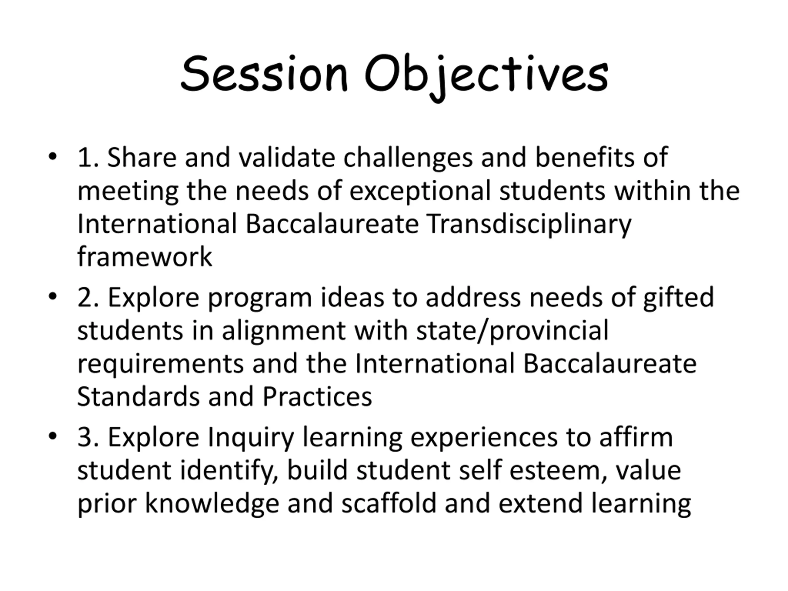 Session Objectives 1. Share and validate challenges and benefits of meeting the needs of exceptional students within the International Baccalaureate Transdisciplinary framework 2. Explore program ideas to address needs of gifted students in alignment with state/provincial requirements and the International Baccalaureate Standards and Practices 3. Explore Inquiry learning experiences to affirm student identify, build student self esteem, value prior knowledge and scaffold and extend learning