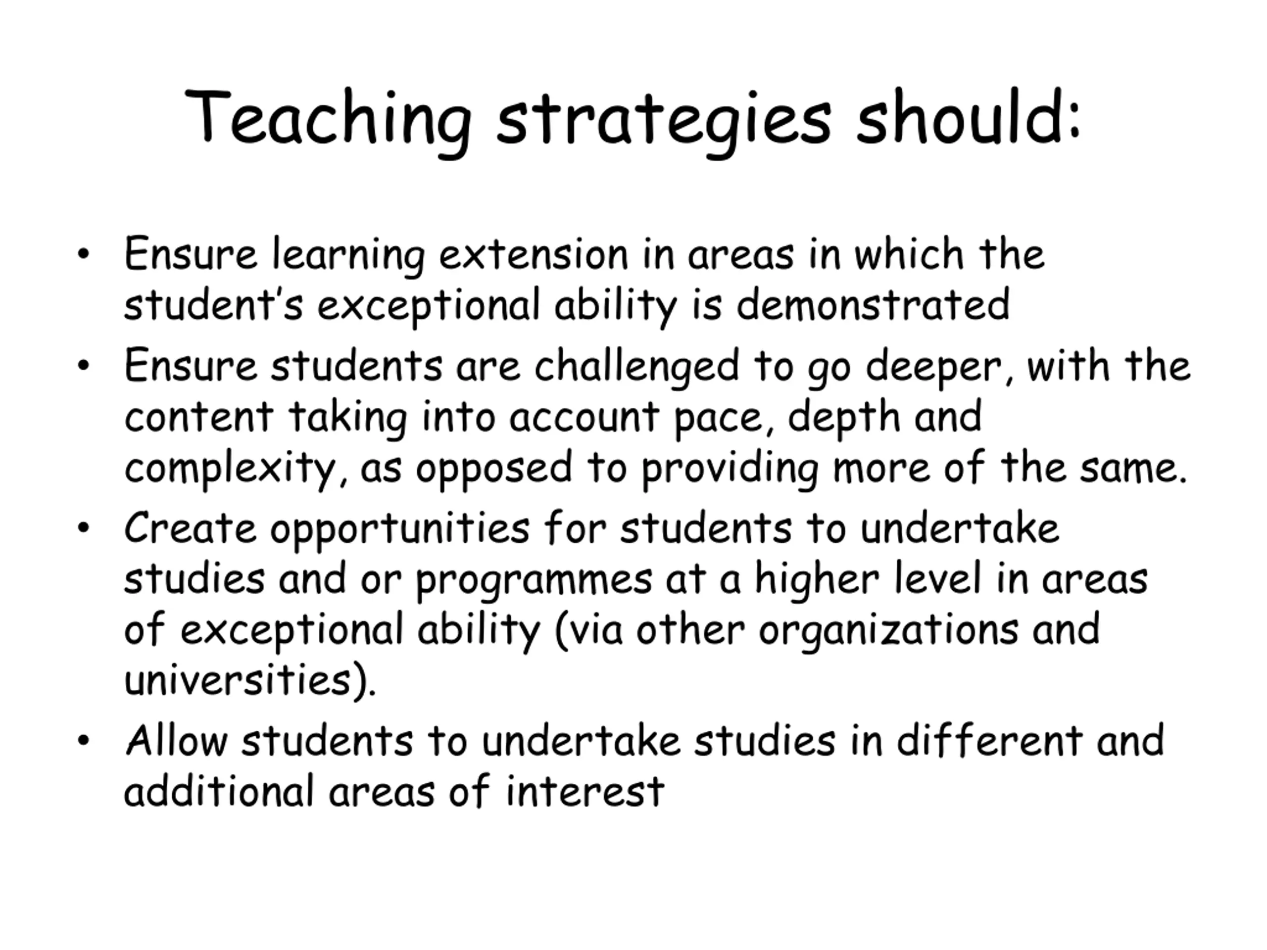 Teaching strategies should: Ensure learning extension in areas in which the student s exceptional ability is demonstrated Ensure students are challenged to go deeper, with the content taking into account pace, depth and complexity, as opposed to providing more of the same. Create opportunities for students to undertake studies and or programmes at a higher level in areas of exceptional ability (via other organizations and universities). Allow students to undertake studies in different and additional areas of interest