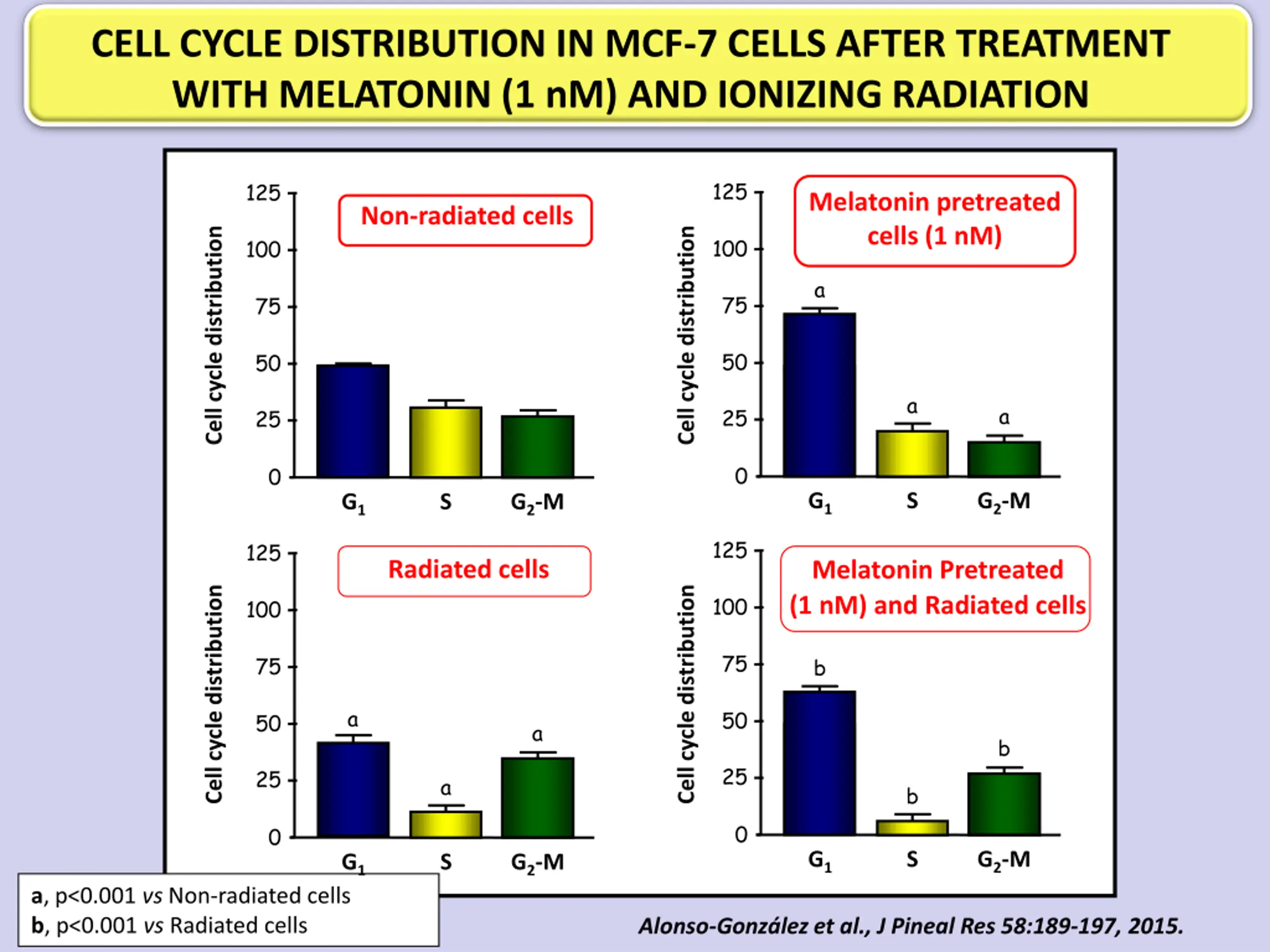 CELL CYCLE DISTRIBUTION IN MCF-7 CELLS AFTER TREATMENT WITH MELATONIN (1 nM) AND IONIZING RADIATION 125 125 Melatonin pretreated cells (1 nM) Non-radiated cells Cell cycle distribution Cell cycle distribution 100 100 a 75 75 50 50 a a 25 25 0 0 G1 S G2-M G1 S G2-M 125 125 Radiated cells Melatonin Pretreated (1 nM) and Radiated cells Cell cycle distribution Cell cycle distribution 100 100 75 75 b a 50 50 a b 25 25 a b 0 0 G1 S G2-M G1 S G2-M a, p<0.001 vs Non-radiated cells b, p<0.001 vs Radiated cells Alonso-Gonz lez et al., J Pineal Res 58:189-197, 2015.