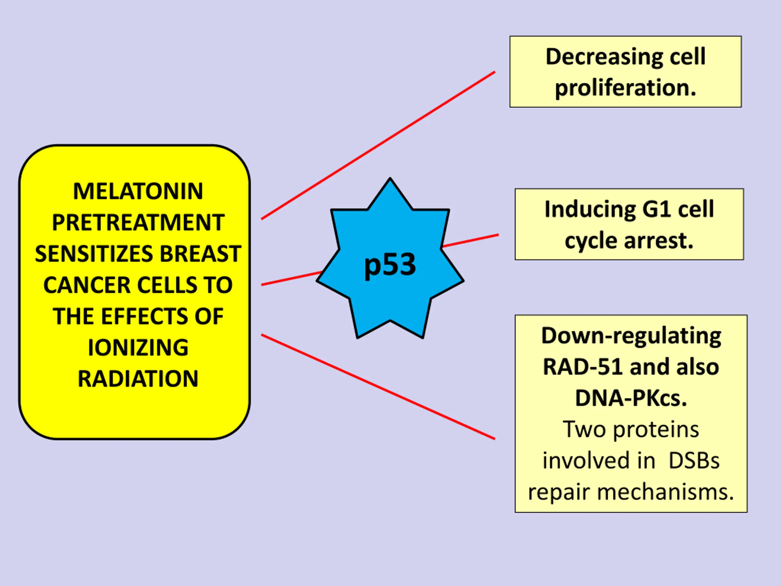 Decreasing cell proliferation. MELATONIN PRETREATMENT SENSITIZES BREAST CANCER CELLS TO THE EFFECTS OF IONIZING RADIATION Inducing G1 cell cycle arrest. p53 Down-regulating RAD-51 and also DNA-PKcs. Two proteins involved in DSBs repair mechanisms.