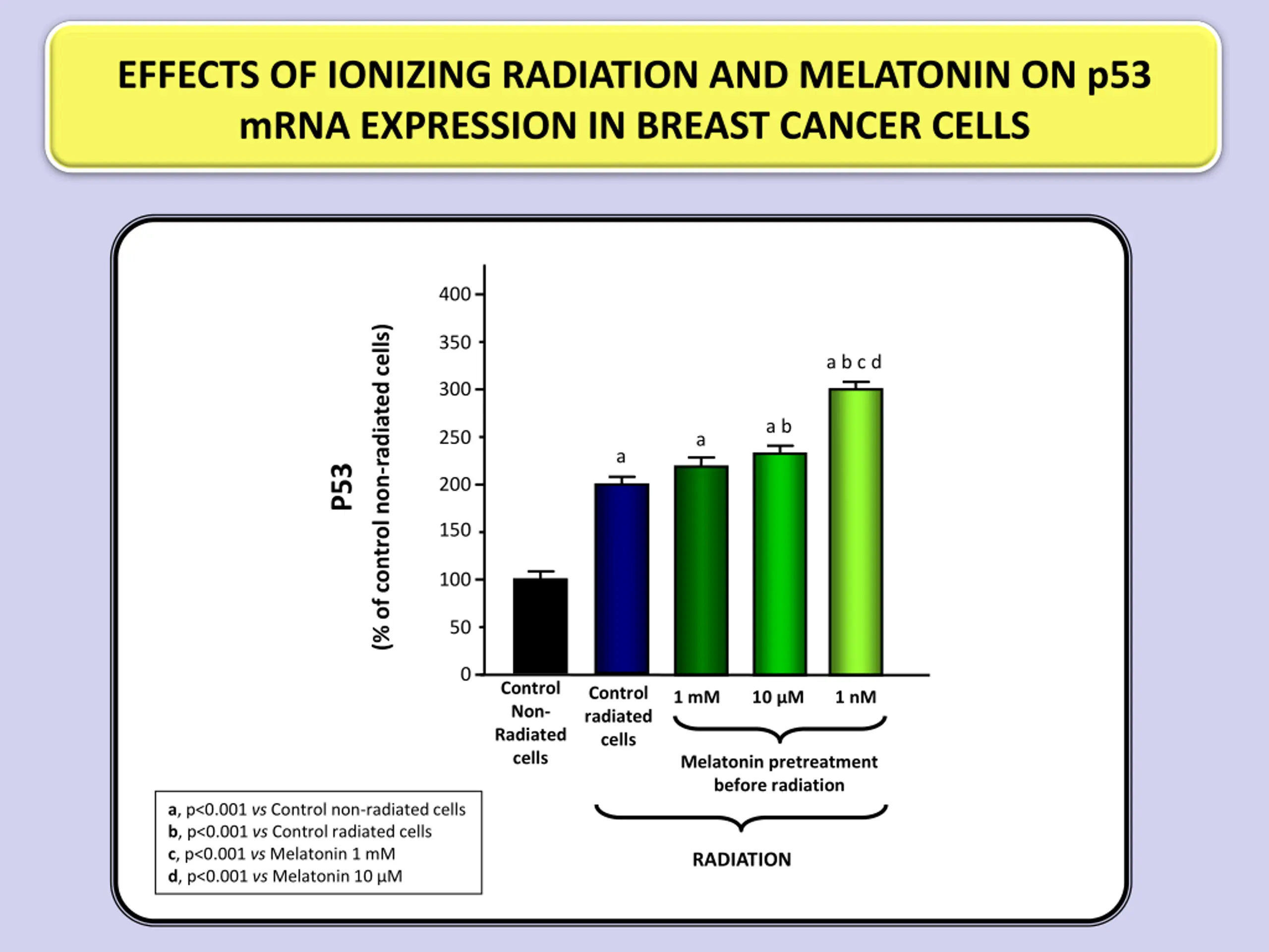 EFFECTS OF IONIZING RADIATION AND MELATONIN ON p53 mRNA EXPRESSION IN BREAST CANCER CELLS 400 (% of control non-radiated cells) 350 a b c d 300 a b 250 a a P53 200 150 100 50 0 Control Non- Radiated cells Control radiated cells 1 mM 10 M 1 nM Melatonin pretreatment before radiation a, p<0.001 vs Control non-radiated cells b, p<0.001 vs Control radiated cells c, p<0.001 vs Melatonin 1 mM d, p<0.001 vs Melatonin 10 M RADIATION