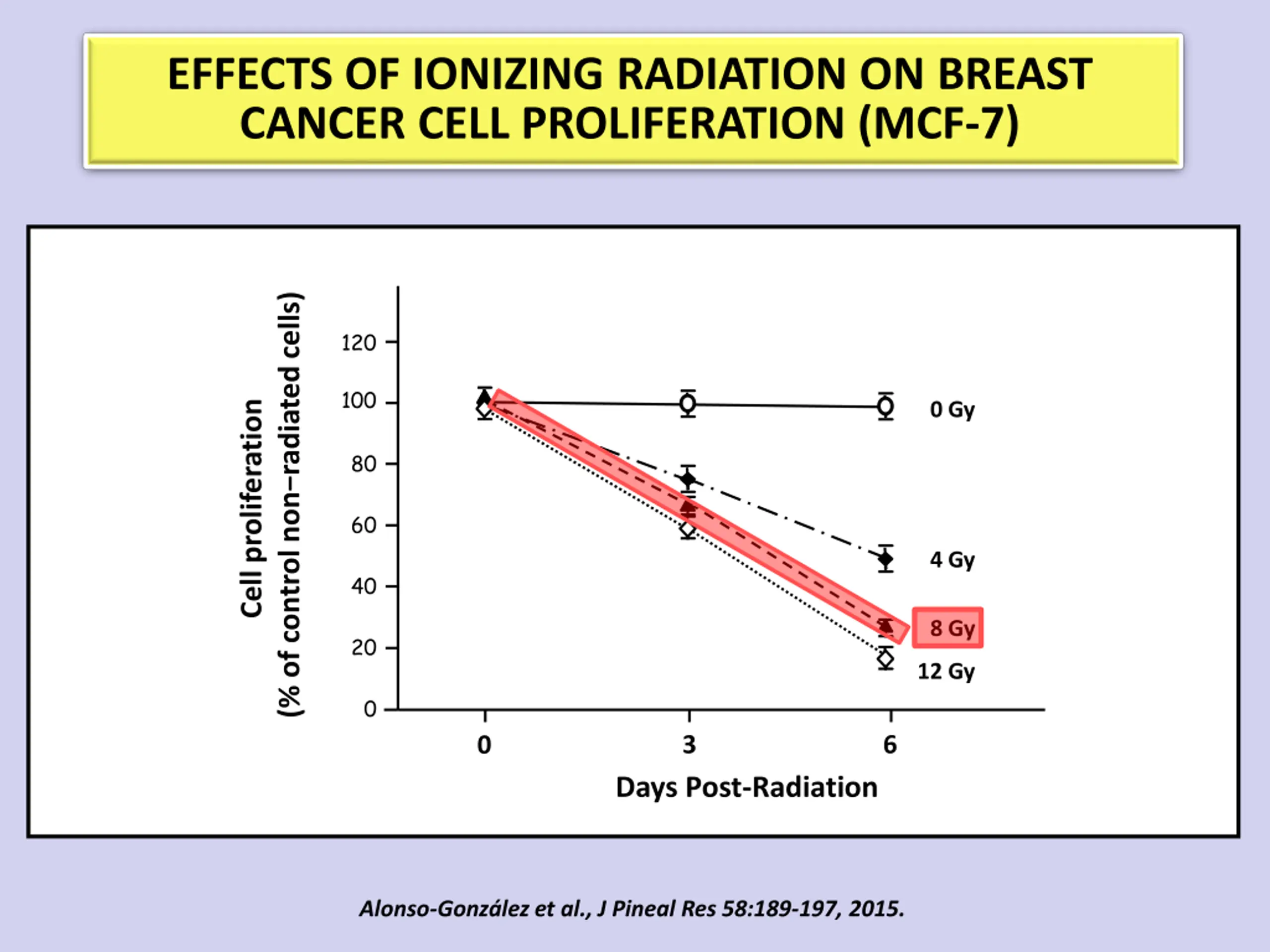 EFFECTS OF IONIZING RADIATION ON BREAST CANCER CELL PROLIFERATION (MCF-7) (% of control non radiated cells) 120 100 Cell proliferation 0 Gy 80 60 4 Gy 40 8 Gy 20 12 Gy 0 3 6 0 Days Post-Radiation Alonso-Gonz lez et al., J Pineal Res 58:189-197, 2015.