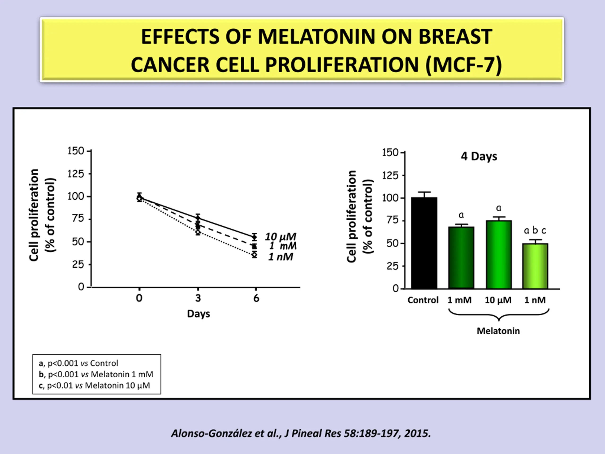 EFFECTS OF MELATONIN ON BREAST CANCER CELL PROLIFERATION (MCF-7) 150 150 4 Days Cell proliferation 125 Cell proliferation 125 (% of control) (% of control) 100 100 a a 75 75 a b c 10 M 50 50 1 mM 1 nM 25 25 0 0 0 3 6 Control 1 mM 10 M 1 nM Days Melatonin a, p<0.001 vs Control b, p<0.001 vs Melatonin 1 mM c, p<0.01 vs Melatonin 10 M Alonso-Gonz lez et al., J Pineal Res 58:189-197, 2015.