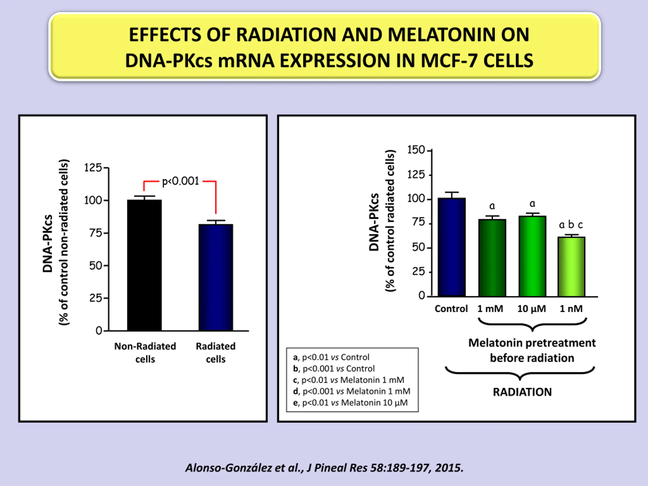 EFFECTS OF RADIATION AND MELATONIN ON DNA-PKcs mRNA EXPRESSION IN MCF-7 CELLS 150 (% of control radiated cells) (% of control non-radiated cells) 125 125 p<0.001 100 100 DNA-PKcs a a 75 DNA-PKcs a b c 75 50 50 25 0 25 Control 1 mM 10 M 1 nM 0 Melatonin pretreatment before radiation Non-Radiated cells Radiated cells a, p<0.01 vs Control b, p<0.001 vs Control c, p<0.01 vs Melatonin 1 mM d, p<0.001 vs Melatonin 1 mM e, p<0.01 vs Melatonin 10 M RADIATION Alonso-Gonz lez et al., J Pineal Res 58:189-197, 2015.
