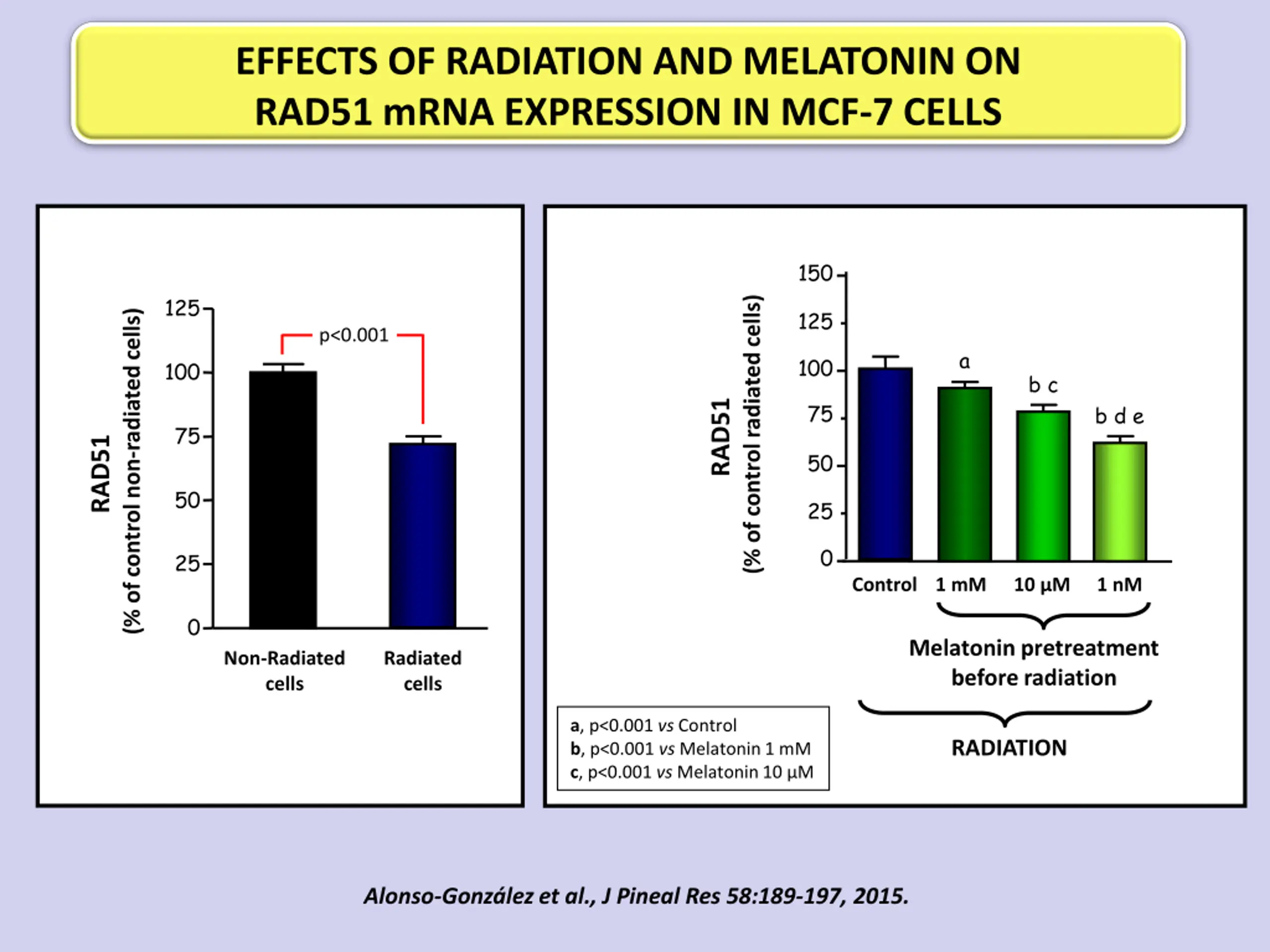 EFFECTS OF RADIATION AND MELATONIN ON RAD51 mRNA EXPRESSION IN MCF-7 CELLS 150 125 (% of control radiated cells) 125 (% of control non-radiated cells) p<0.001 a 100 100 b c RAD51 75 b d e 75 RAD51 50 50 25 0 25 Control 1 mM 10 M 1 nM 0 Melatonin pretreatment before radiation Non-Radiated cells Radiated cells a, p<0.001 vs Control b, p<0.001 vs Melatonin 1 mM c, p<0.001 vs Melatonin 10 M RADIATION Alonso-Gonz lez et al., J Pineal Res 58:189-197, 2015.