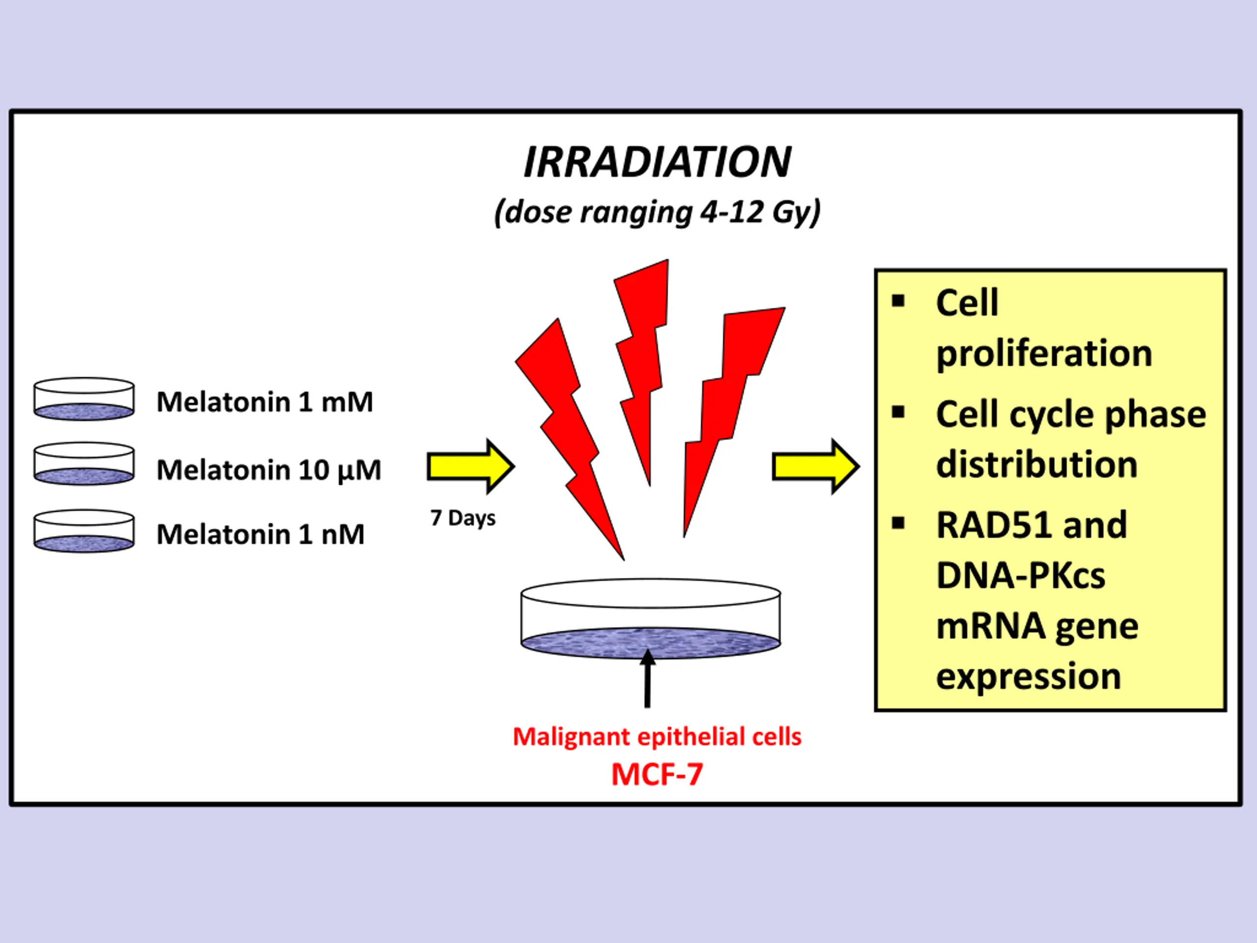 IRRADIATION (dose ranging 4-12 Gy) Cell proliferation Cell cycle phase distribution RAD51 and DNA-PKcs mRNA gene expression Melatonin 1 mM Melatonin 10 M 7 Days Melatonin 1 nM Malignant epithelial cells MCF-7