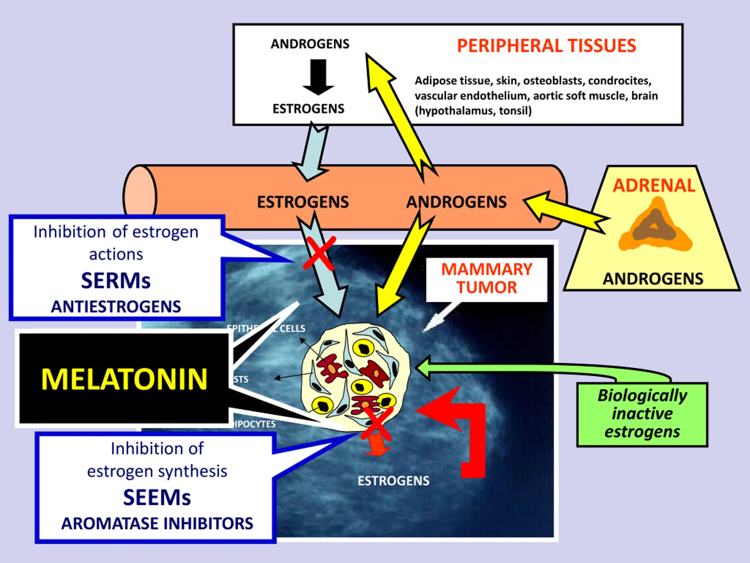 PERIPHERAL TISSUES ANDROGENS Adipose tissue, skin, osteoblasts, condrocites, vascular endothelium, aortic soft muscle, brain (hypothalamus, tonsil) ESTROGENS ADRENAL ESTROGENS x ANDROGENS Inhibitionof estrogen actions SERMs ANTIESTROGENS MAMMARY TUMOR ANDROGENS EPITHELIAL CELLS MELATONIN x FIBROBLASTS Biologically inactive estrogens ADIPOCYTES Inhibition of estrogen synthesis SEEMs AROMATASE INHIBITORS ESTROGENS
