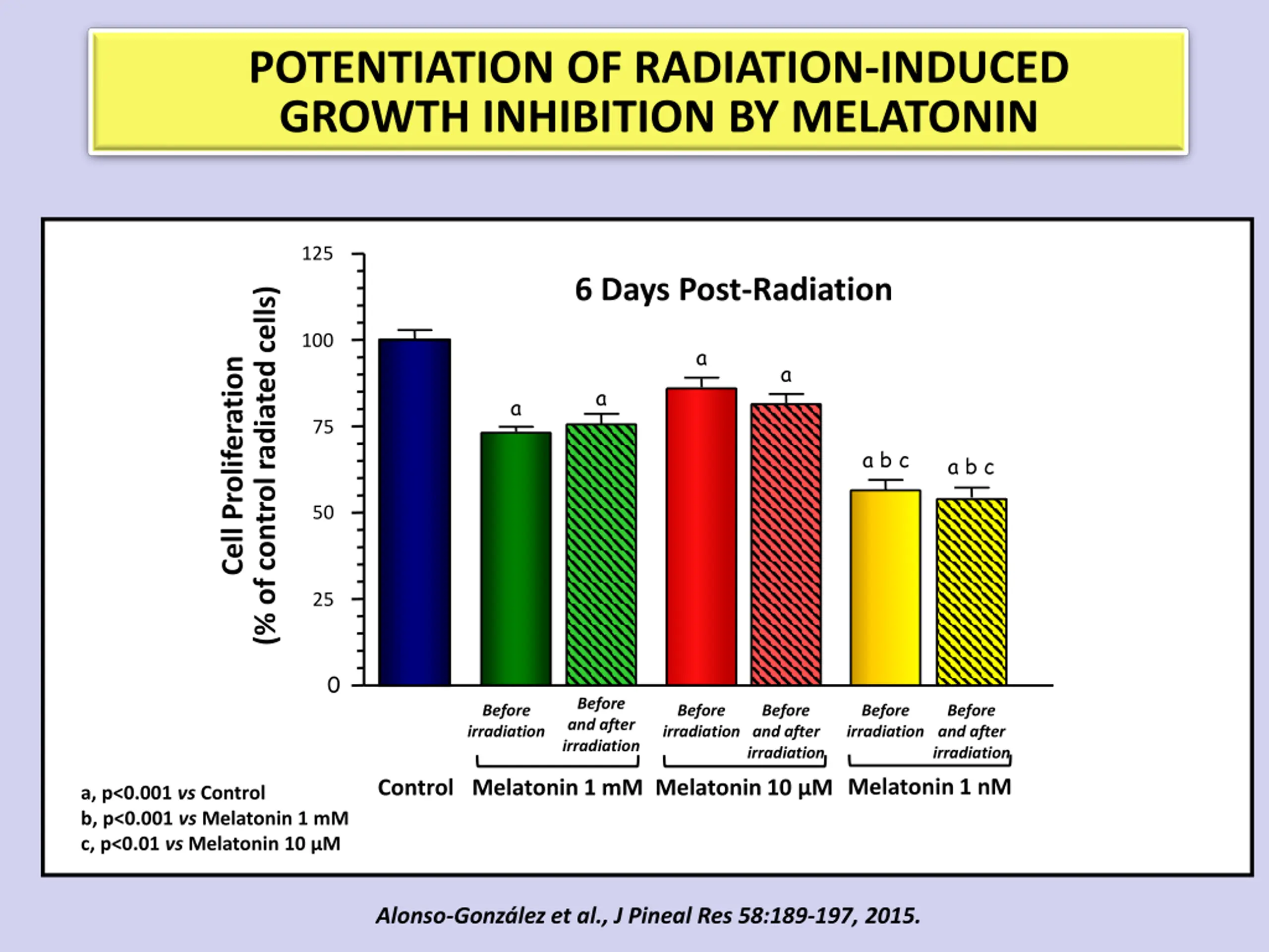 POTENTIATION OF RADIATION-INDUCED GROWTH INHIBITION BY MELATONIN 125 6 Days Post-Radiation (% of control radiated cells) 100 a Cell Proliferation a a a 75 a b c a b c 50 25 0 Before and after irradiation Before irradiation Before irradiation Before and after irradiation Before irradiation Before and after irradiation Control Melatonin 1 mM Melatonin 10 M Melatonin 1 nM a, p<0.001 vs Control b, p<0.001 vs Melatonin 1 mM c, p<0.01 vs Melatonin 10 M Alonso-Gonz lez et al., J Pineal Res 58:189-197, 2015.
