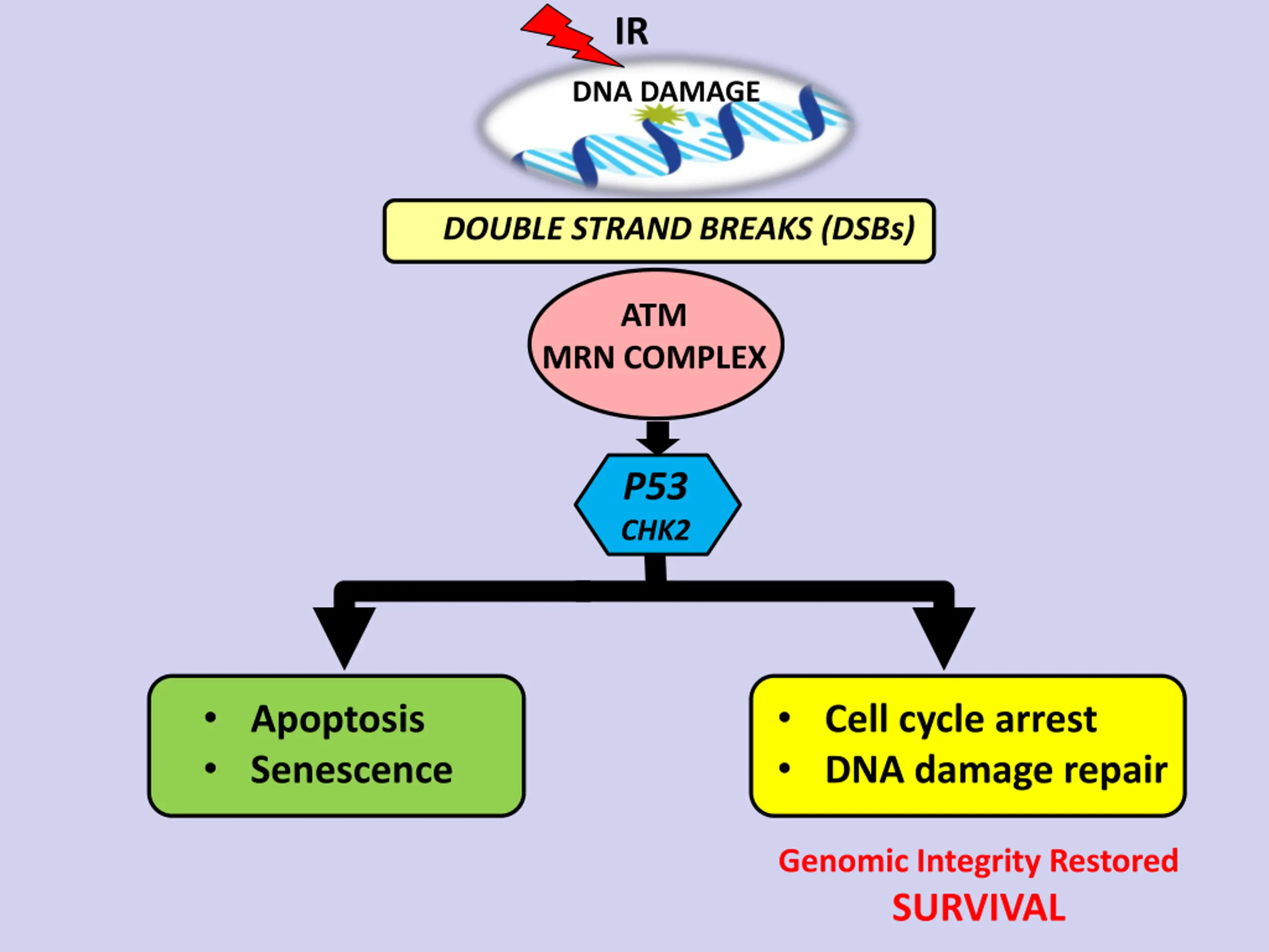 IR DNA DAMAGE DOUBLE STRAND BREAKS (DSBs) ATM MRN COMPLEX P53 CHK2 Apoptosis Senescence Cell cycle arrest DNA damage repair Genomic Integrity Restored SURVIVAL