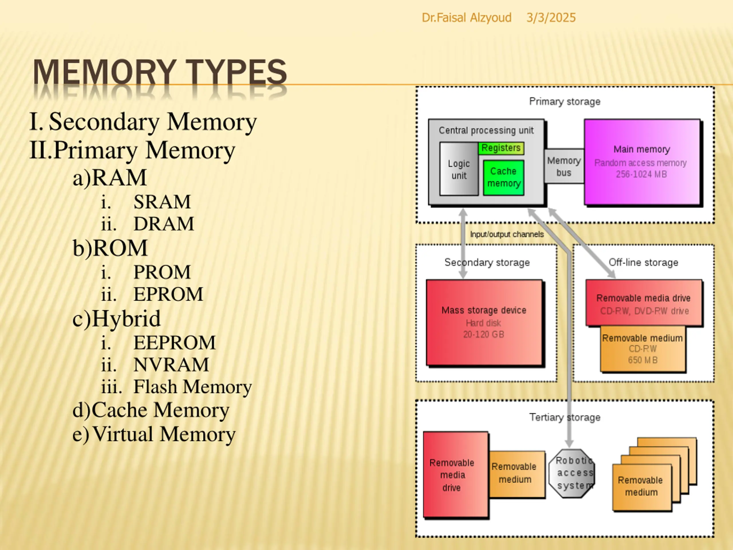 Dr.Faisal Alzyoud 3/3/2025 MEMORY TYPES I.Secondary Memory II.Primary Memory a)RAM i. SRAM ii. DRAM b)ROM i. PROM ii. EPROM c)Hybrid i. EEPROM ii. NVRAM iii. Flash Memory d)Cache Memory e)Virtual Memory