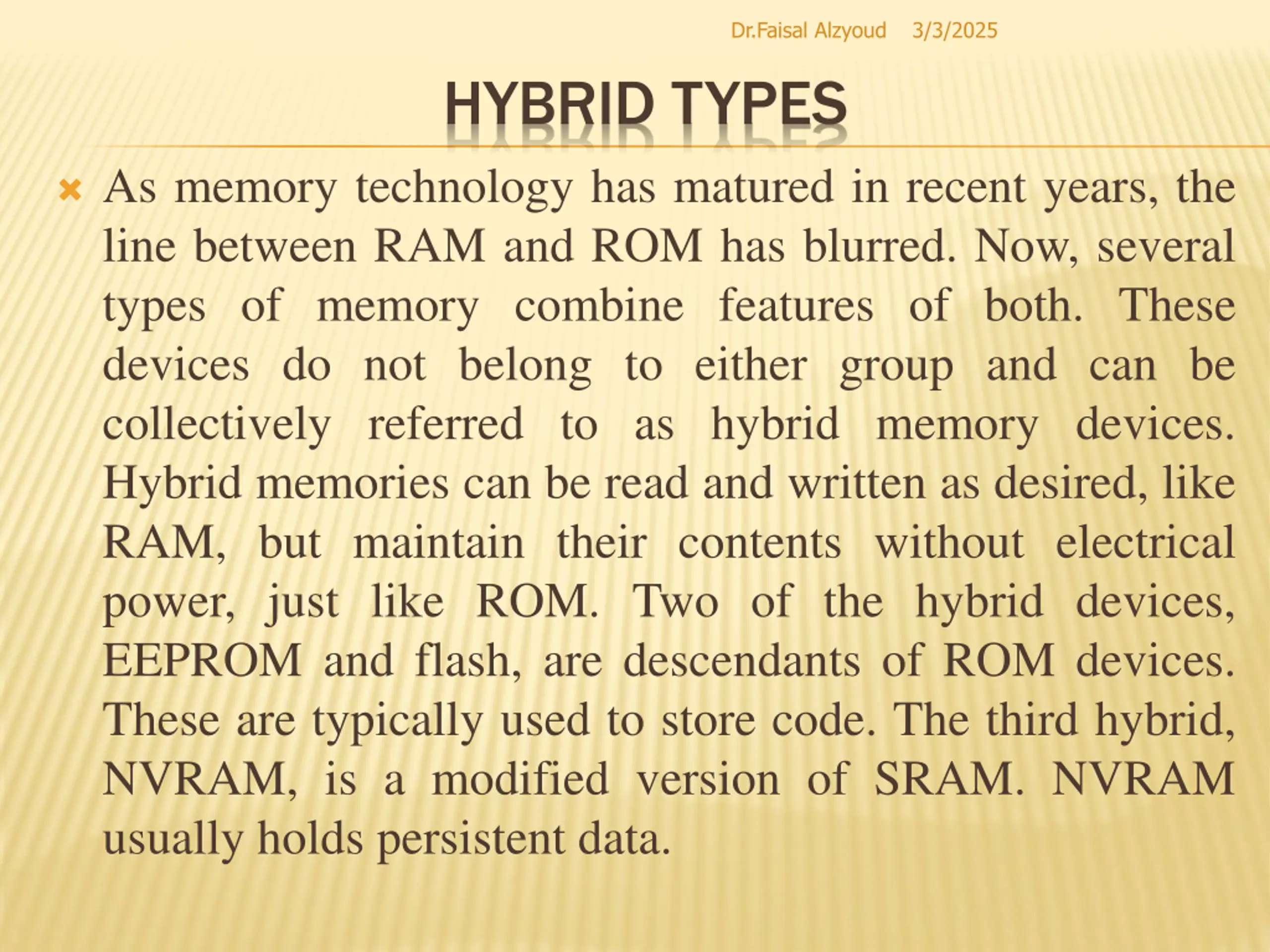 Dr.Faisal Alzyoud 3/3/2025 HYBRID TYPES As memory technology has matured in recent years, the line between RAM and ROM has blurred. Now, several types of memory combine features of both. These devices do not belong to either group and can be collectively referred to as hybrid memory devices. Hybrid memories can be read and written as desired, like RAM, but maintain their contents without electrical power, just like ROM. Two of the hybrid devices, EEPROM and flash, are descendants of ROM devices. These are typically used to store code. The third hybrid, NVRAM, is a modified version of SRAM. NVRAM usually holds persistent data.