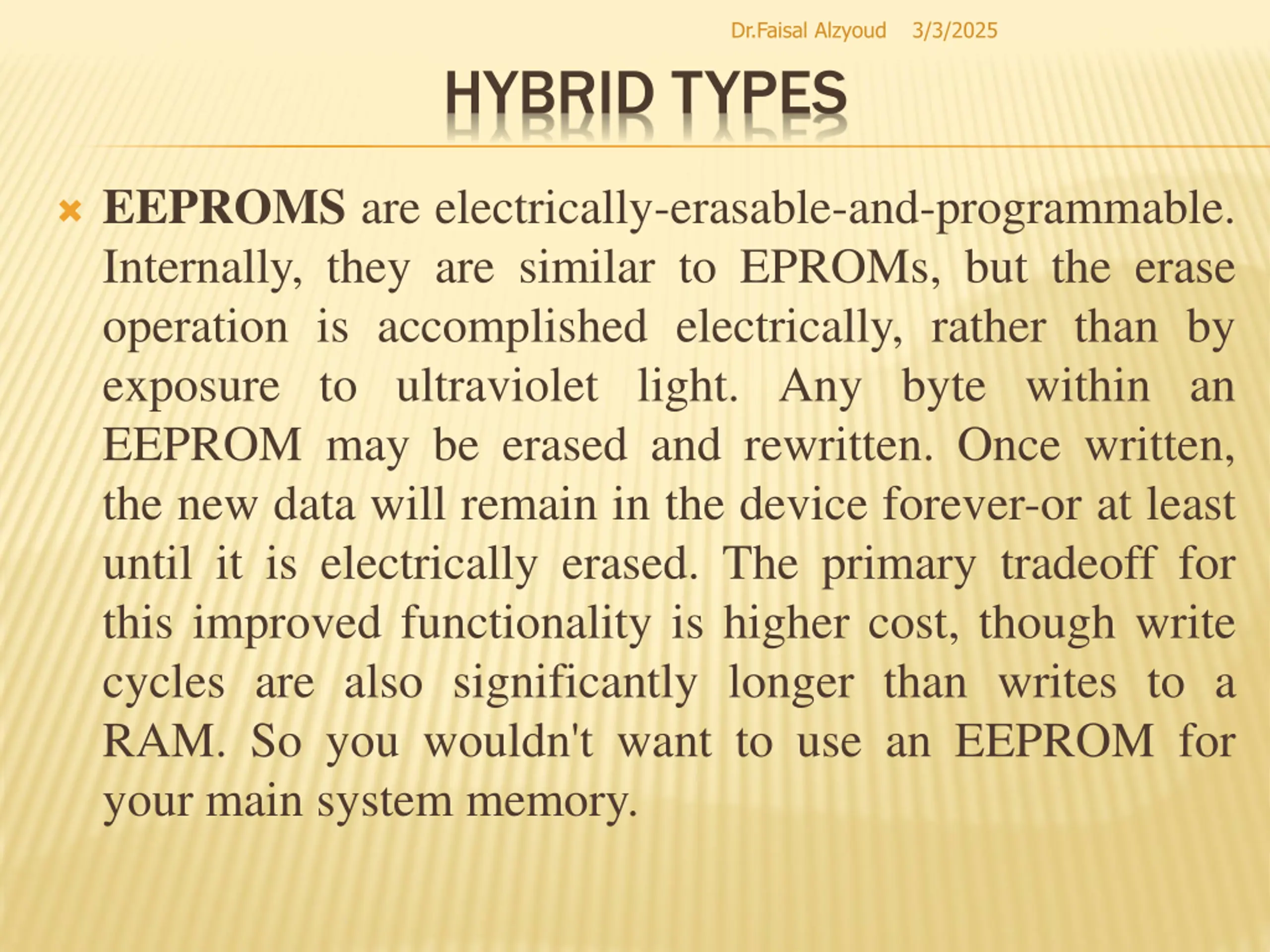 Dr.Faisal Alzyoud 3/3/2025 HYBRID TYPES EEPROMS are electrically-erasable-and-programmable. Internally, they are similar to EPROMs, but the erase operation is accomplished electrically, rather than by exposure to ultraviolet light. Any byte within an EEPROM may be erased and rewritten. Once written, the new data will remain in the device forever-or at least until it is electrically erased. The primary tradeoff for this improved functionality is higher cost, though write cycles are also significantly longer than writes to a RAM. So you wouldn't want to use an EEPROM for your main system memory.