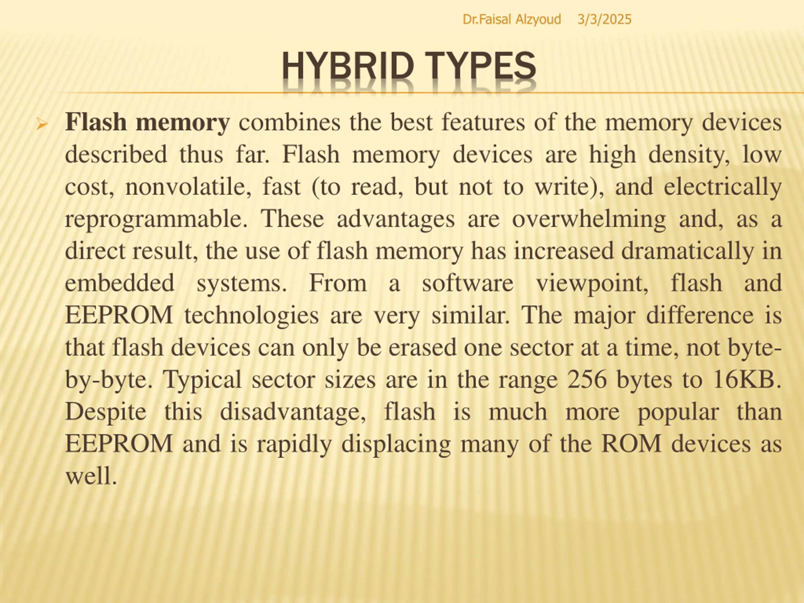 Dr.Faisal Alzyoud 3/3/2025 HYBRID TYPES Flash memory combines the best features of the memory devices described thus far. Flash memory devices are high density, low cost, nonvolatile, fast (to read, but not to write), and electrically reprogrammable. These advantages are overwhelming and, as a direct result, the use of flash memory has increased dramatically in embedded systems. From a software viewpoint, flash and EEPROM technologies are very similar. The major difference is that flash devices can only be erased one sector at a time, not byte- by-byte. Typical sector sizes are in the range 256 bytes to 16KB. Despite this disadvantage, flash is much more popular than EEPROM and is rapidly displacing many of the ROM devices as well.