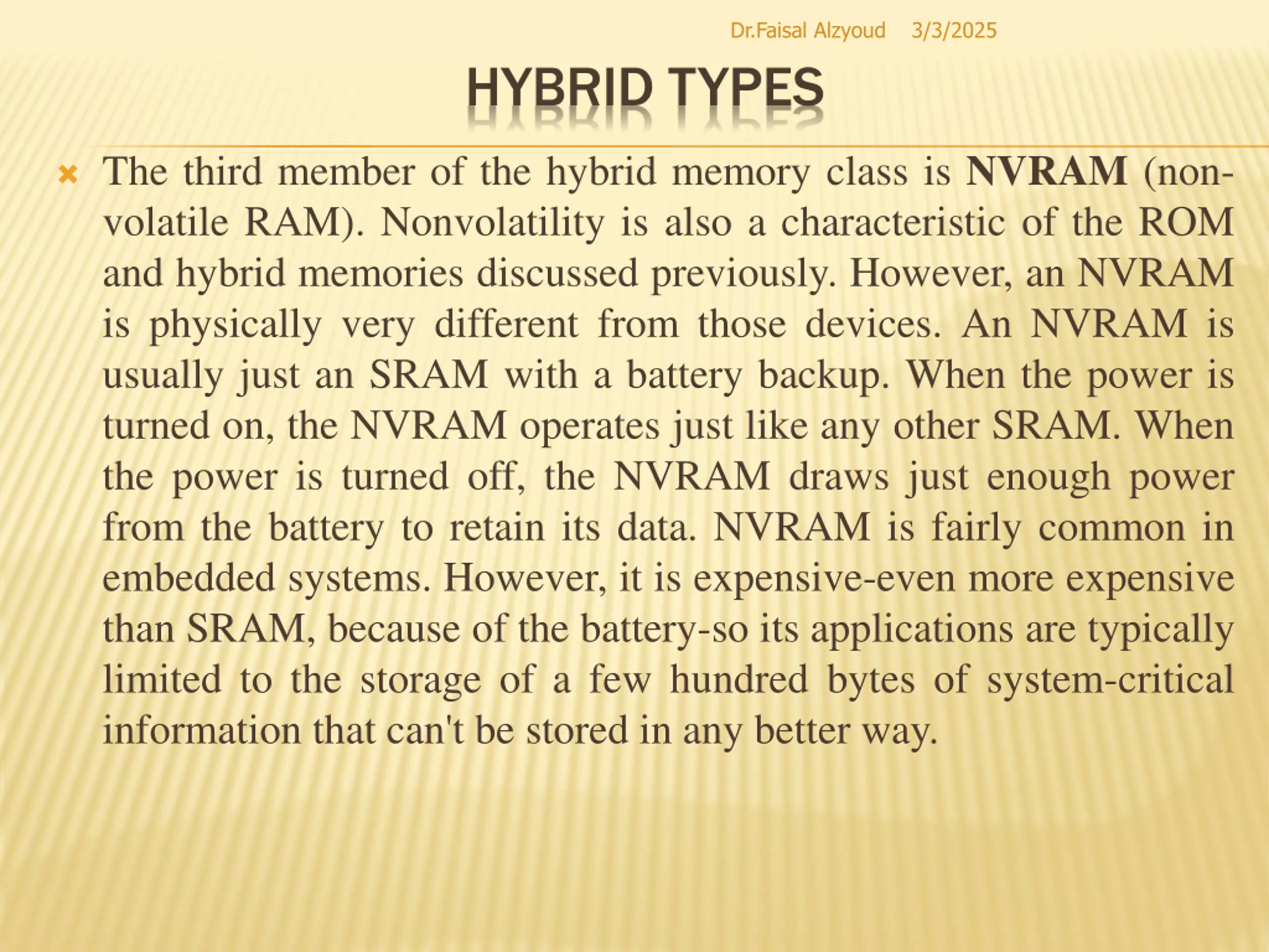 Dr.Faisal Alzyoud 3/3/2025 HYBRID TYPES The third member of the hybrid memory class is NVRAM (non- volatile RAM). Nonvolatility is also a characteristic of the ROM and hybrid memories discussed previously. However, an NVRAM is physically very different from those devices. An NVRAM is usually just an SRAM with a battery backup. When the power is turned on, the NVRAM operates just like any other SRAM. When the power is turned off, the NVRAM draws just enough power from the battery to retain its data. NVRAM is fairly common in embedded systems. However, it is expensive-even more expensive than SRAM, because of the battery-so its applications are typically limited to the storage of a few hundred bytes of system-critical information that can't be stored in any better way.
