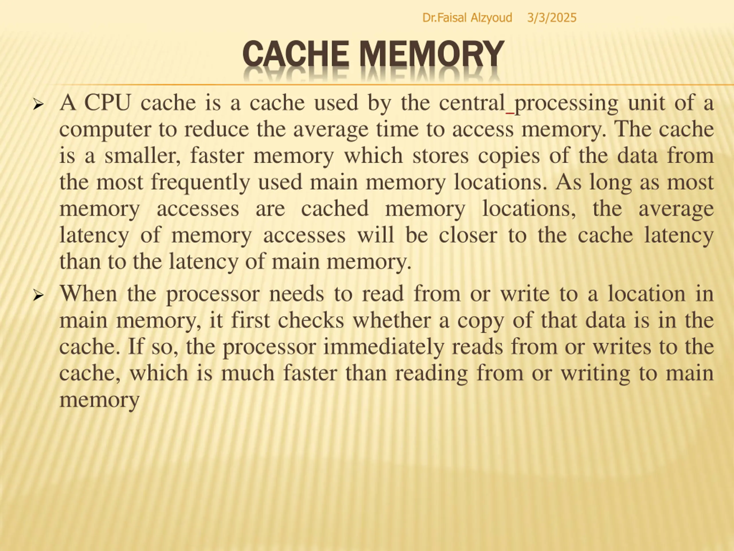 Dr.Faisal Alzyoud 3/3/2025 CACHE MEMORY CACHE MEMORY A CPU cache is a cache used by the central processing unit of a computer to reduce the average time to access memory. The cache is a smaller, faster memory which stores copies of the data from the most frequently used main memory locations. As long as most memory accesses are cached memory locations, the average latency of memory accesses will be closer to the cache latency than to the latency of main memory. When the processor needs to read from or write to a location in main memory, it first checks whether a copy of that data is in the cache. If so, the processor immediately reads from or writes to the cache, which is much faster than reading from or writing to main memory