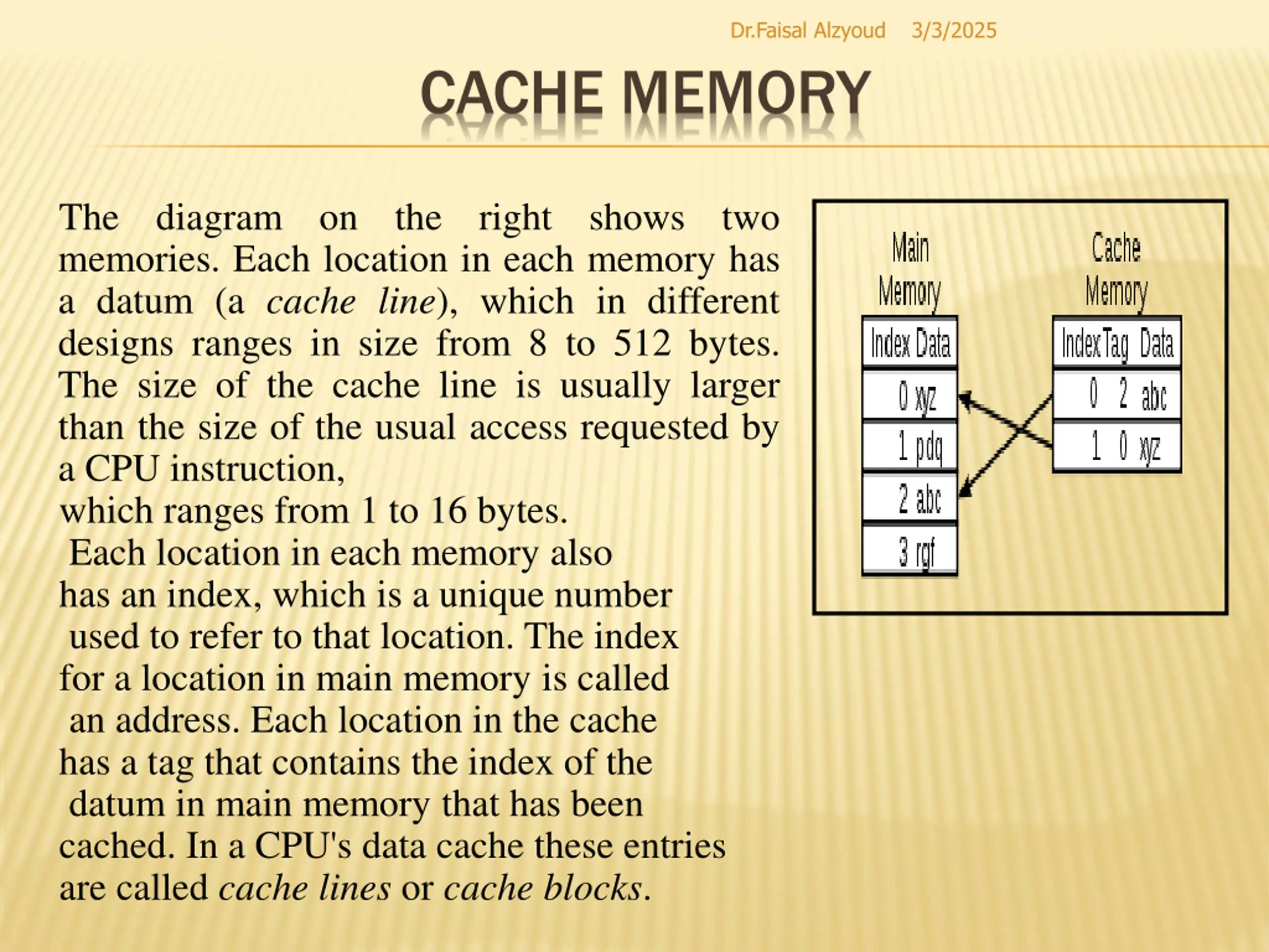 Dr.Faisal Alzyoud 3/3/2025 CACHE MEMORY The diagram on the right shows two memories. Each location in each memory has a datum (a cache line), which in different designs ranges in size from 8 to 512 bytes. The size of the cache line is usually larger than the size of the usual access requested by a CPU instruction, which ranges from 1 to 16 bytes. Each location in each memory also has an index, which is a unique number used to refer to that location. The index for a location in main memory is called an address. Each location in the cache has a tag that contains the index of the datum in main memory that has been cached. In a CPU's data cache these entries are called cache lines or cache blocks.