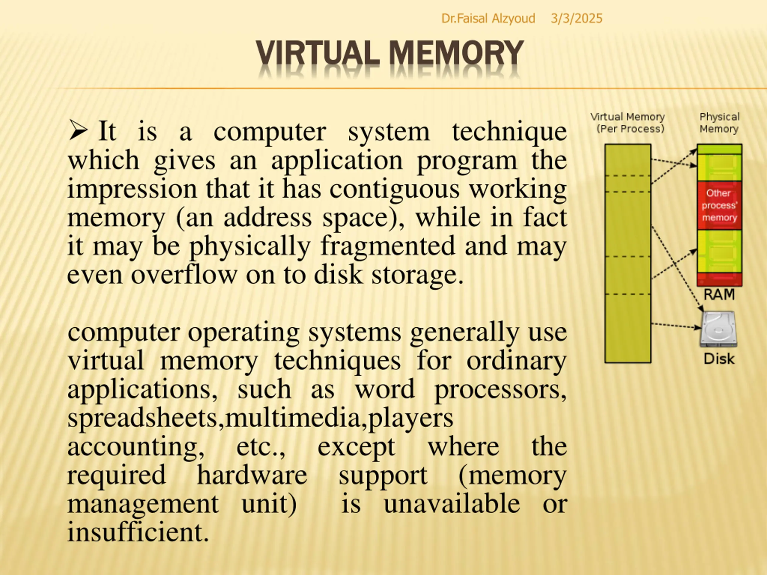 Dr.Faisal Alzyoud 3/3/2025 VIRTUAL MEMORY VIRTUAL MEMORY It is a computer system technique which gives an application program the impression that it has contiguous working memory (an address space), while in fact it may be physically fragmented and may even overflow on to disk storage. computer operating systems generally use virtual memory techniques for ordinary applications, such as word processors, spreadsheets,multimedia,players accounting, etc., except where the required hardware support (memory management unit) is unavailable or insufficient.