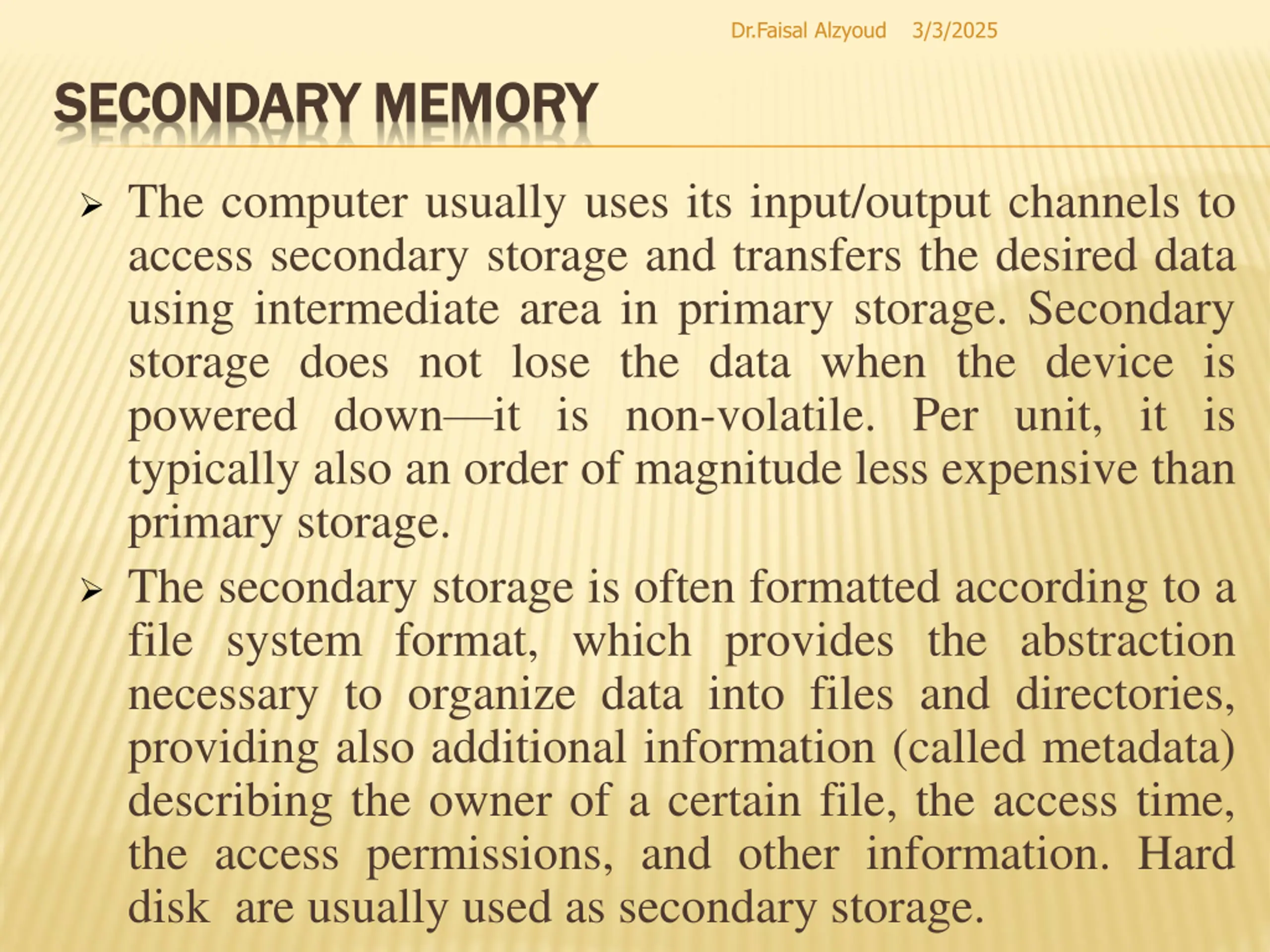 Dr.Faisal Alzyoud 3/3/2025 SECONDARY MEMORY SECONDARY MEMORY The computer usually uses its input/output channels to access secondary storage and transfers the desired data using intermediate area in primary storage. Secondary storage does not lose the data when the device is powered down it is non-volatile. Per unit, it is typically also an order of magnitude less expensive than primary storage. The secondary storage is often formatted according to a file system format, which provides the abstraction necessary to organize data into files and directories, providing also additional information (called metadata) describing the owner of a certain file, the access time, the access permissions, and other information. Hard disk are usually used as secondary storage.