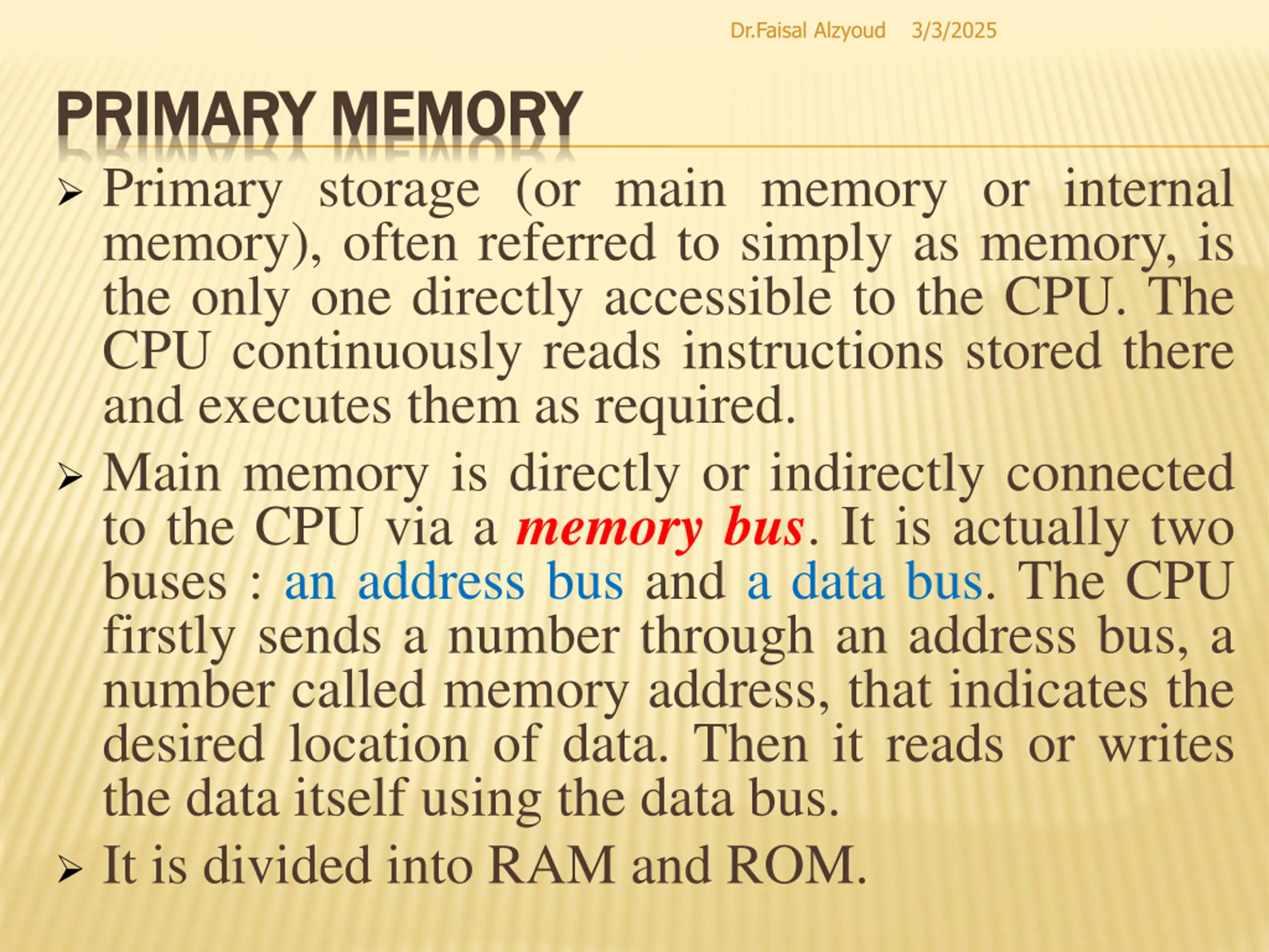 Dr.Faisal Alzyoud 3/3/2025 PRIMARY MEMORY PRIMARY MEMORY Primary storage (or main memory or internal memory), often referred to simply as memory, is the only one directly accessible to the CPU. The CPU continuously reads instructions stored there and executes them as required. Main memory is directly or indirectly connected to the CPU via a memory bus. It is actually two buses : an address bus and a data bus. The CPU firstly sends a number through an address bus, a number called memory address, that indicates the desired location of data. Then it reads or writes the data itself using the data bus. It is divided into RAM and ROM.