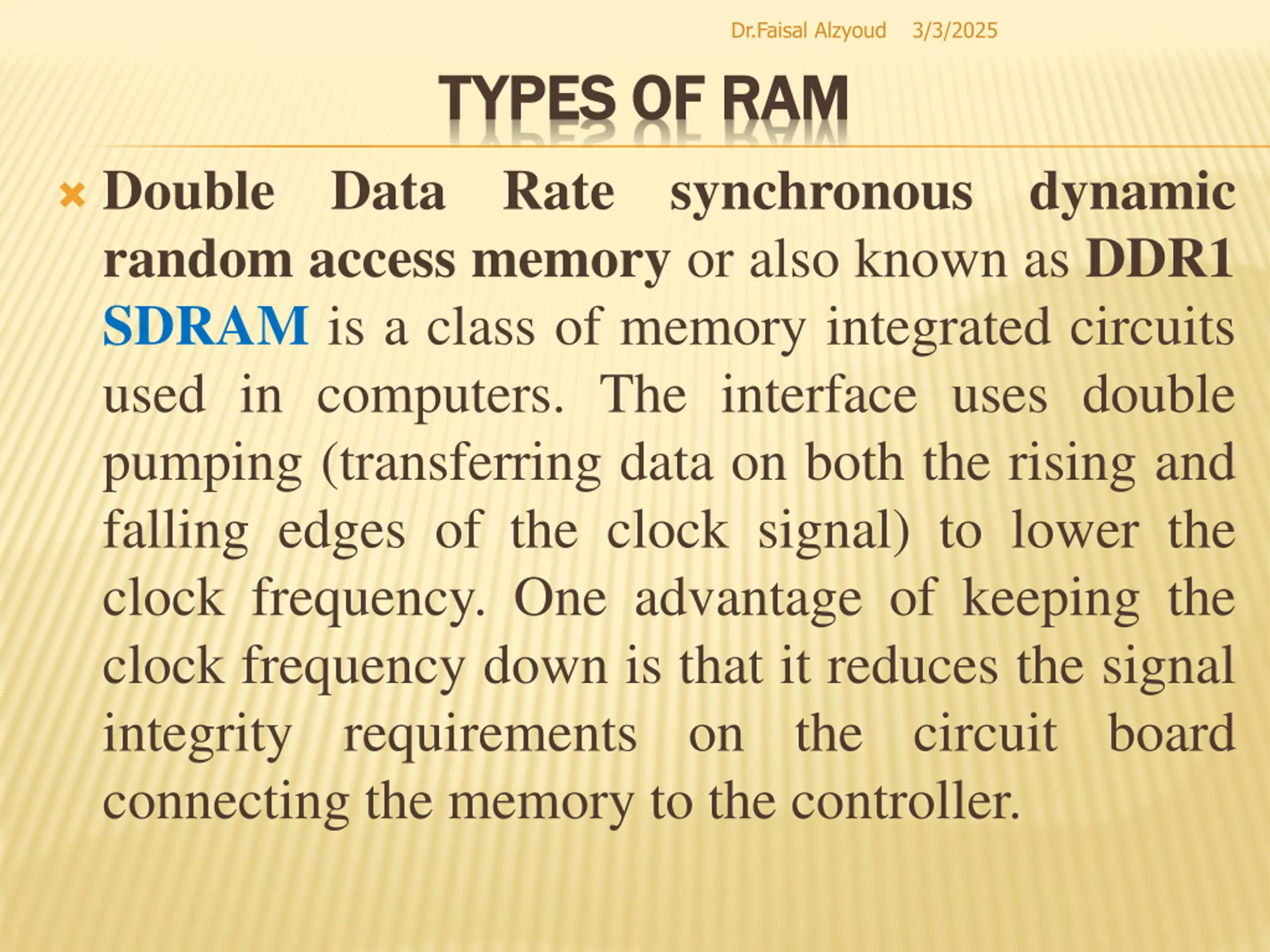 Dr.Faisal Alzyoud 3/3/2025 TYPES OF RAM TYPES OF RAM Double Data Rate synchronous dynamic random access memory or also known as DDR1 SDRAM is a class of memory integrated circuits used in computers. The interface uses double pumping (transferring data on both the rising and falling edges of the clock signal) to lower the clock frequency. One advantage of keeping the clock frequency down is that it reduces the signal integrity requirements on the circuit board connecting the memory to the controller.