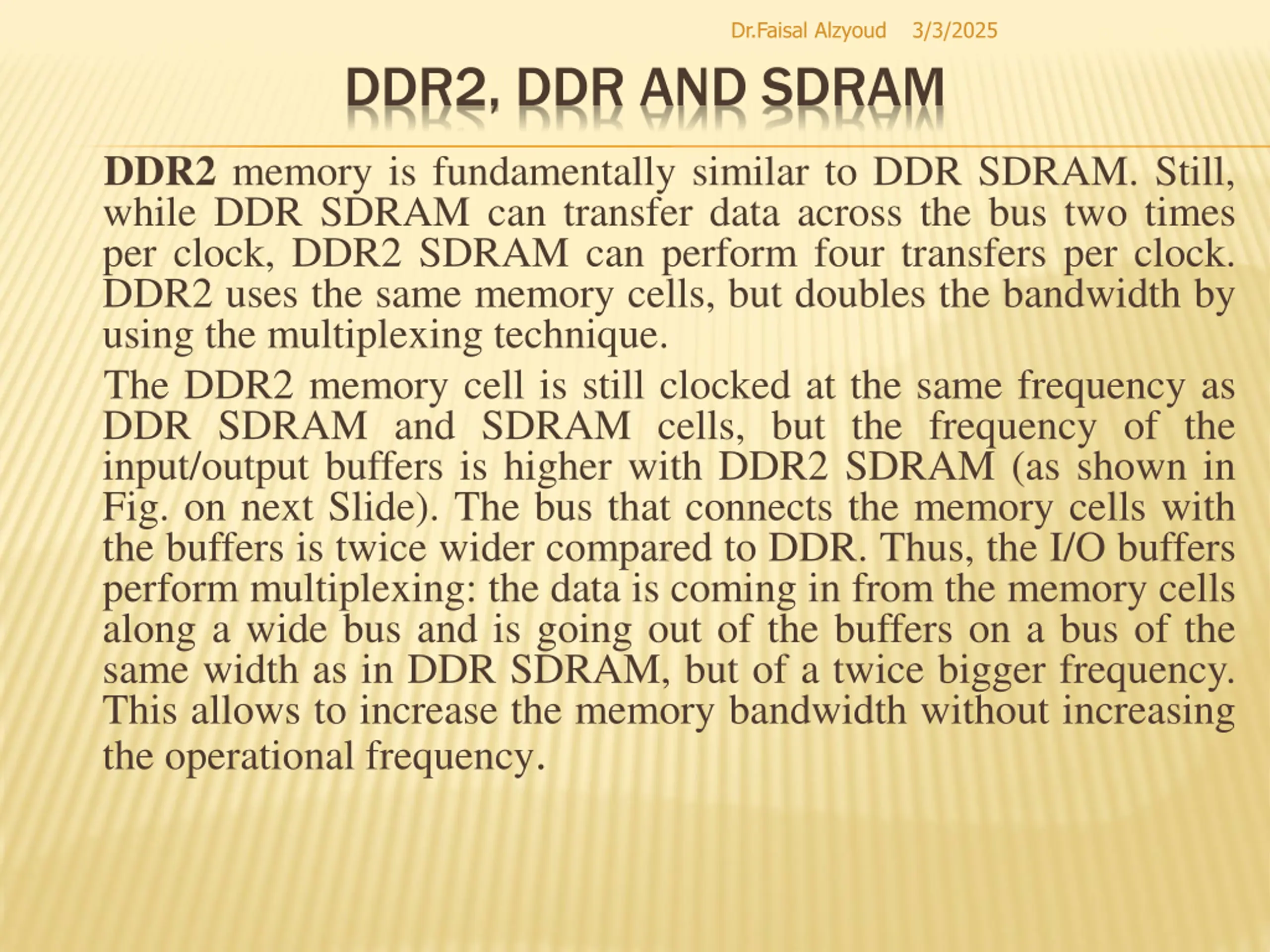 Dr.Faisal Alzyoud 3/3/2025 DDR2, DDR AND SDRAM DDR2 memory is fundamentally similar to DDR SDRAM. Still, while DDR SDRAM can transfer data across the bus two times per clock, DDR2 SDRAM can perform four transfers per clock. DDR2 uses the same memory cells, but doubles the bandwidth by using the multiplexing technique. The DDR2 memory cell is still clocked at the same frequency as DDR SDRAM and SDRAM cells, but the frequency of the input/output buffers is higher with DDR2 SDRAM (as shown in Fig. on next Slide). The bus that connects the memory cells with the buffers is twice wider compared to DDR. Thus, the I/O buffers perform multiplexing: the data is coming in from the memory cells along a wide bus and is going out of the buffers on a bus of the same width as in DDR SDRAM, but of a twice bigger frequency. This allows to increase the memory bandwidth without increasing the operational frequency.