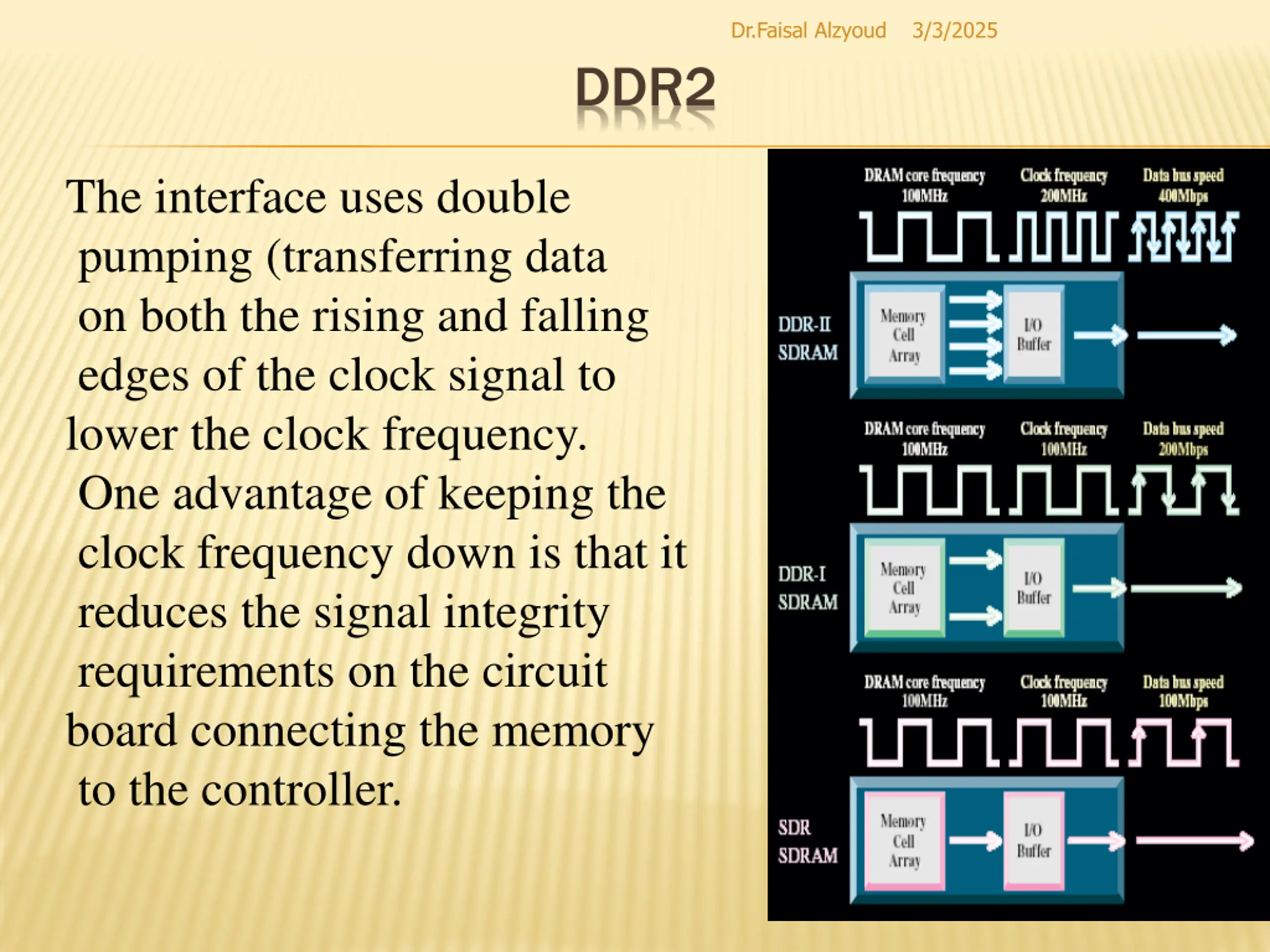 Dr.Faisal Alzyoud 3/3/2025 DDR2 The interface uses double pumping (transferring data on both the rising and falling edges of the clock signal to lower the clock frequency. One advantage of keeping the clock frequency down is that it reduces the signal integrity requirements on the circuit board connecting the memory to the controller.