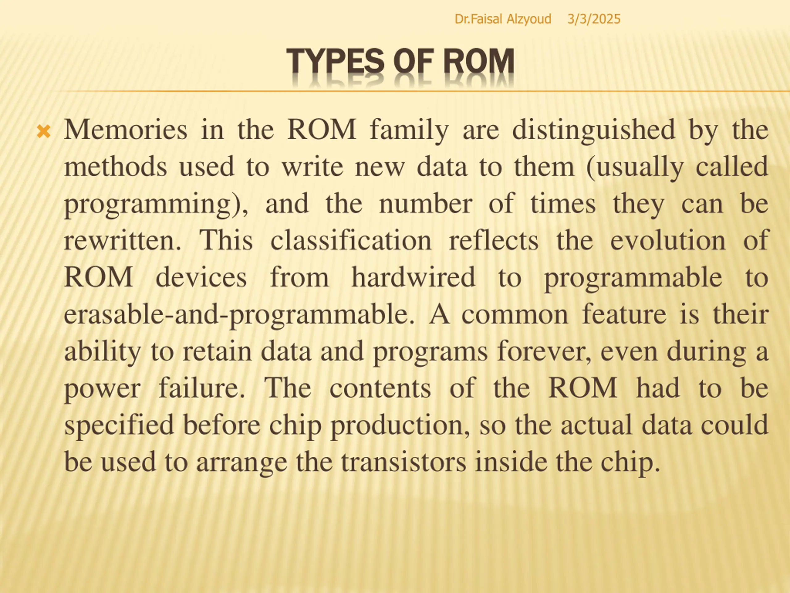 Dr.Faisal Alzyoud 3/3/2025 TYPES OF ROM TYPES OF ROM Memories in the ROM family are distinguished by the methods used to write new data to them (usually called programming), and the number of times they can be rewritten. This classification reflects the evolution of ROM devices from hardwired to programmable to erasable-and-programmable. A common feature is their ability to retain data and programs forever, even during a power failure. The contents of the ROM had to be specified before chip production, so the actual data could be used to arrange the transistors inside the chip.